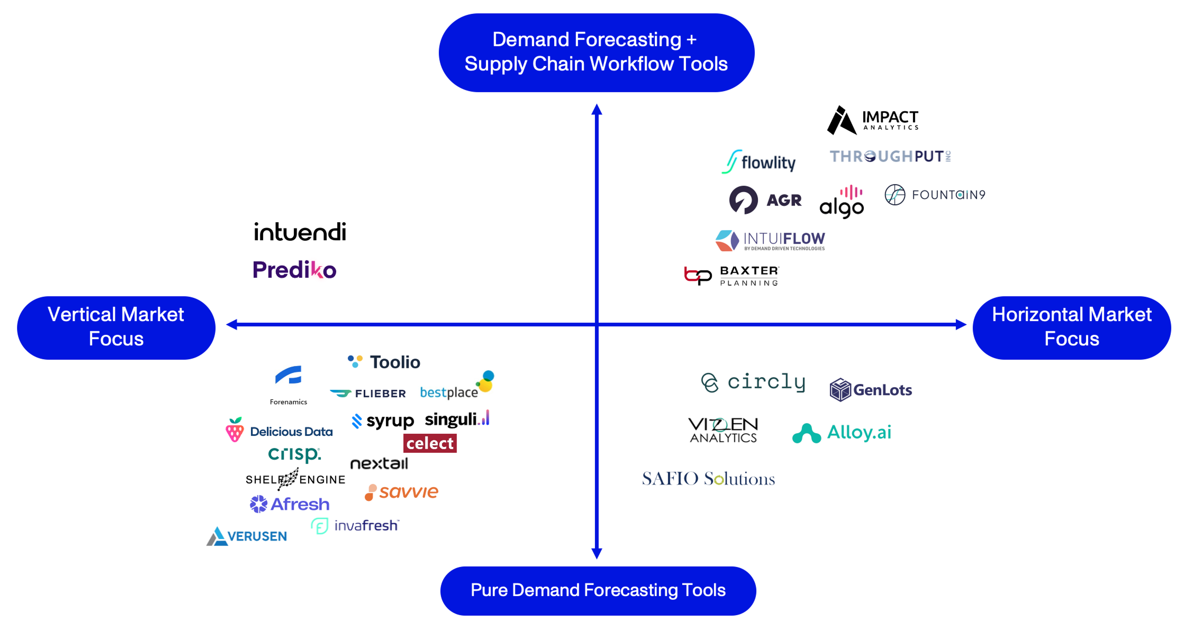 We have, therefore, mapped the landscape using a vertical market vs. horizontal market focus on the one hand and a pure demand forecasting solution vs. a suite of demand forecasting and related workflow tools on the other hand. Most of the players mapped are system agnostic and are thus able to integrate with existing ERP or alternative sources to get historical and real-time internal data to use in their demand forecasting models and algorithms.