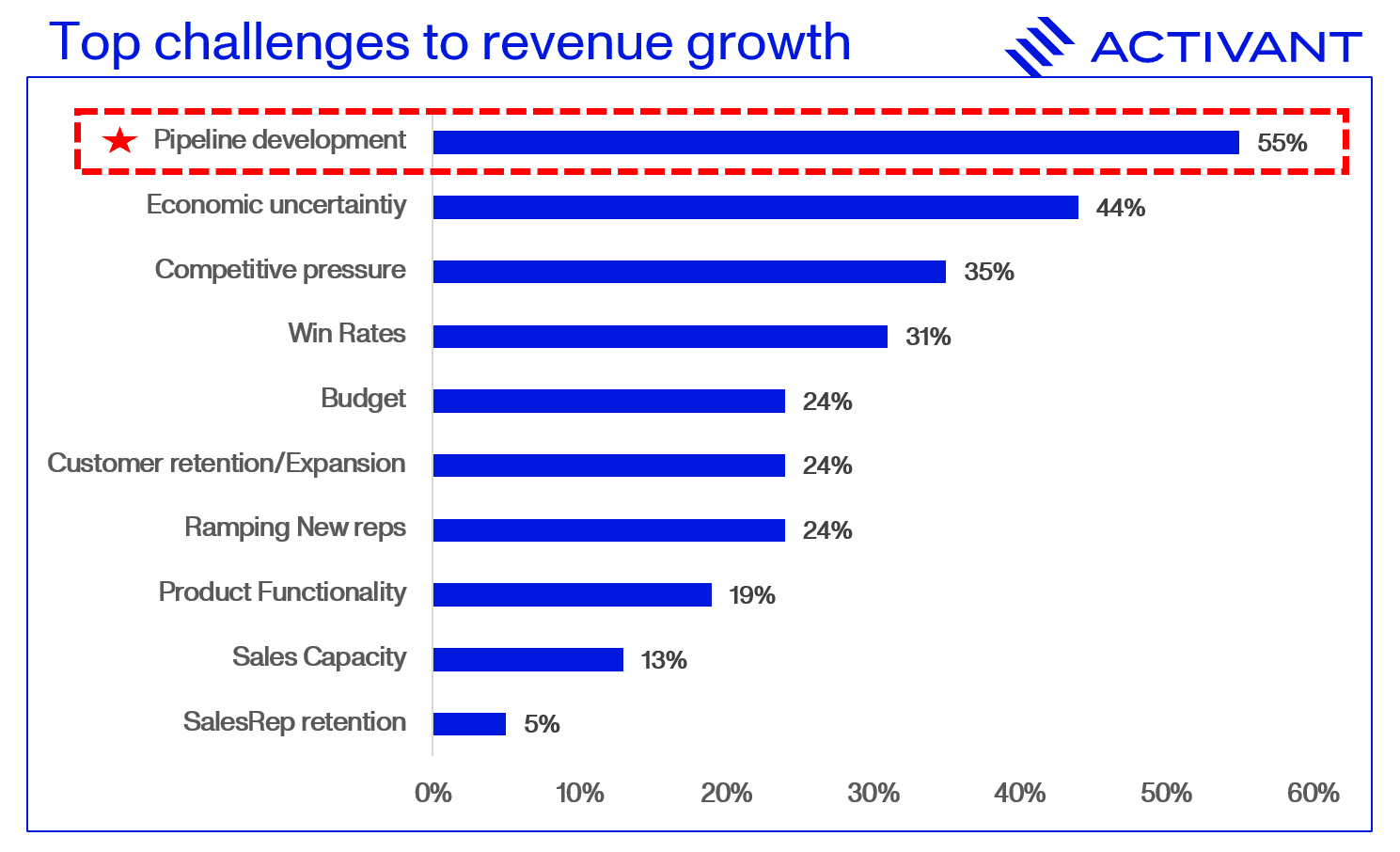 According to Salesloft’s October 2023 benchmark survey, pipeline development remains the greatest challenge for revenue growth.1 55% of the respondents identified this as the greatest challenge, while 31% identified win rates, 24% focused on customer retention and expansion, and 13% prioritized sales capacity. RevOps platforms have the capabilities to mitigate these issues and will benefit from the adoption of pipeline-centric business models.