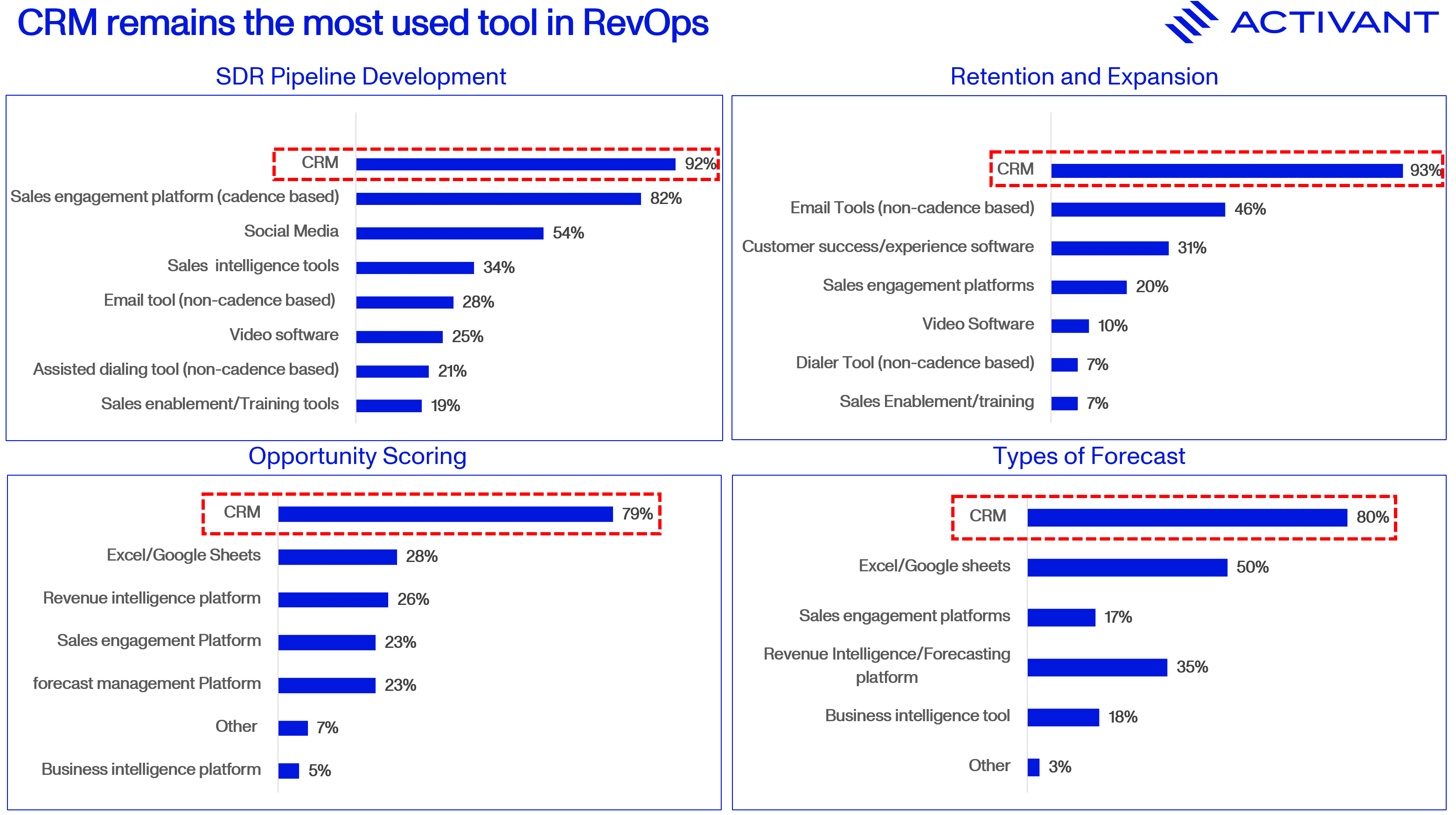 Legacy systems still dominate, clearly shown in Salesloft’s Revenue Engagement study.3 CRM remains the most utilized application for sales development, customer retention, opportunity scoring, and forecasting. The complexity and inefficiencies these systems bring necessitate a new approach, highlighting the potential for transformation.