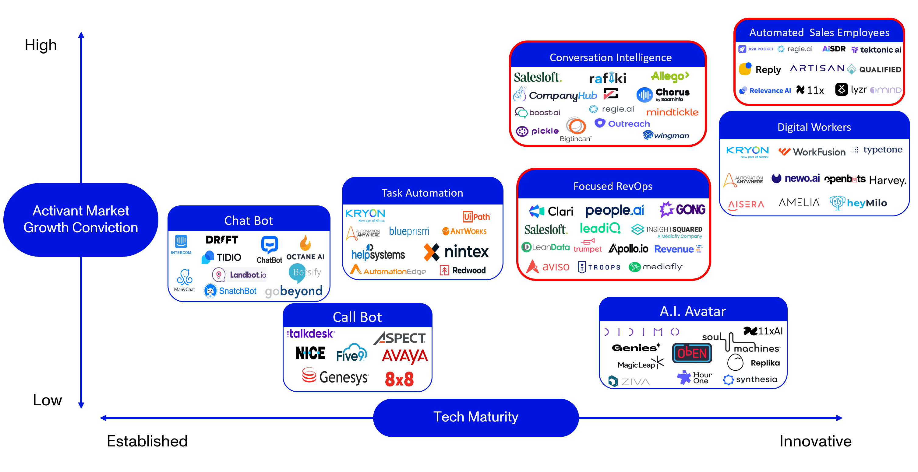 This road to “virtual employees” is a move from AI assistants to AI employees. Our Activant thesis map, shown below, highlights the key segments of the market and arrays these against our view on tech maturity and our conviction in the market growth potential. We find conversational intelligence, focused RevOps, and automated employees to be the three segments most interesting for investment.