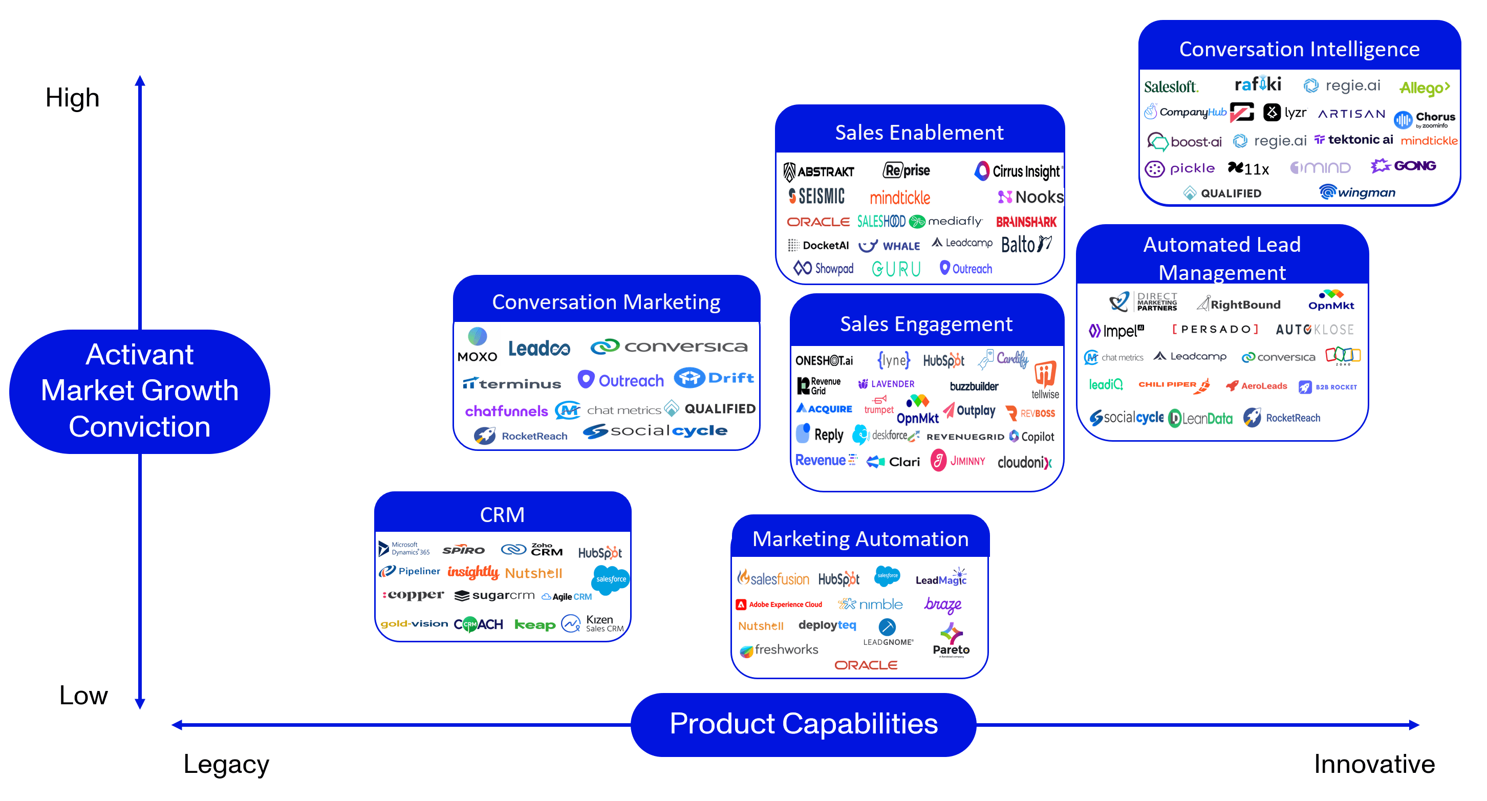 In our Activant RevOps Market Map, we have broken out the key components and use cases of this diverse market, including marketing automation, conversational intelligence, sales enablement, sales engagement, conversational marketing, lead management, and CRMs.