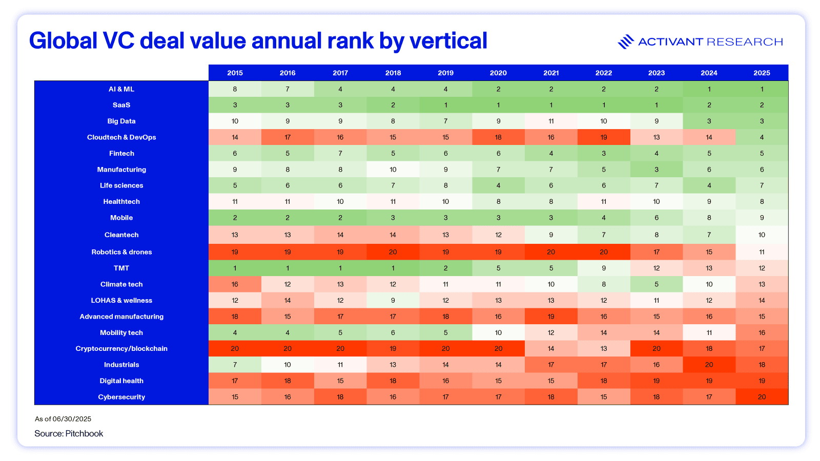 While the total number of global venture deals has fallen from its 2021 peak, Pitchbook shows the proportion of AI/ML deals grew. In Q2 2021, "other" deals outnumbered AI/ML deals by more than four to one (11,048 to 2,533). By Q2 2025–in a much tighter market–that ratio had compressed to just over two to one, with AI/ML deals at 2,146 versus 5,126 across all other sectors. The takeaway is clear: as the proportion of AI/ML deals grows against a backdrop of fewer overall deals, capital and founder attention are inevitably consolidating into the AI sector.