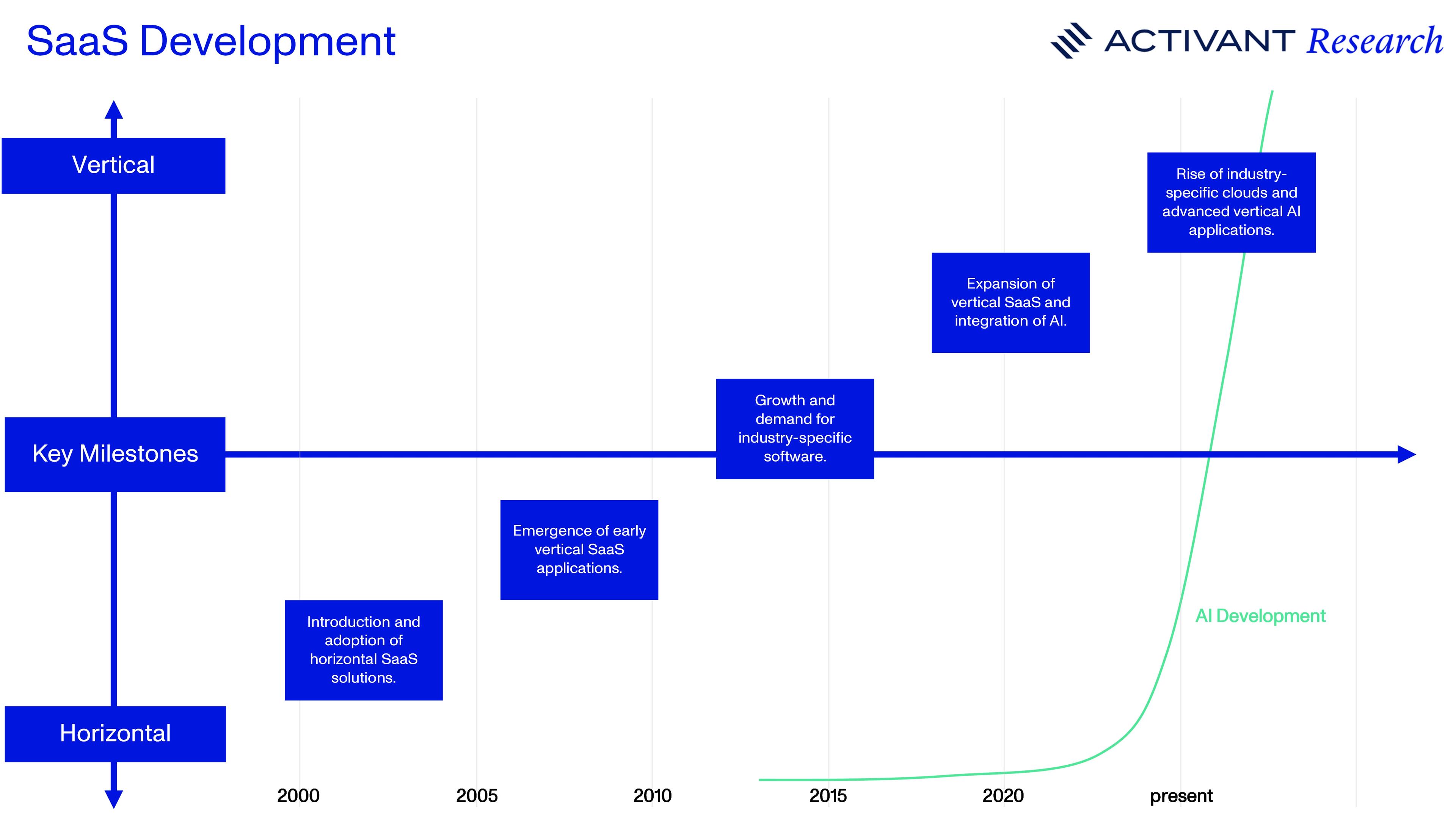 Between 2000 and 2005, SaaS began to gain traction with companies like Salesforce pioneering cloud-based CRM, initially offering generic functionalities. By the late 2000s, as the cloud market matured, businesses recognized the need for industry-specific solutions, leading to the emergence of vertical SaaS. The early 2010s saw significant growth in vertical SaaS, and by the late 2010s, there was a notable expansion and integration of these solutions.
