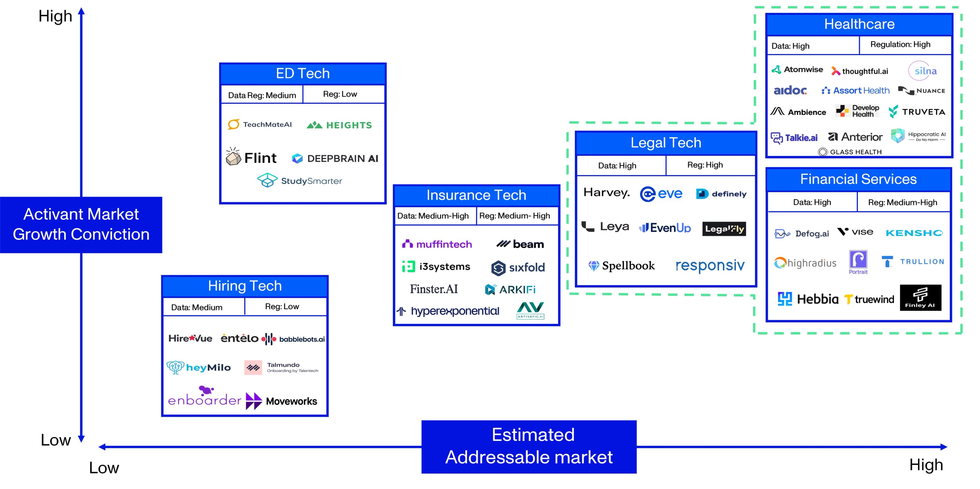 Beyond the financial and insurance sectors, significant developments are also emerging in the legal, edtech and hiring industries. Currently, the AI agent market landscape is dominated by players who either focus on specific verticals or excel in horizontal capabilities. While we have evaluated several pioneering players in these fields, we recognize that this market environment is very dynamic. New industries and companies are continually evolving, demonstrating advanced capabilities. Notably, there is strong movement in heavily regulated industries, where advancements in AI-driven efficiency were unforeseen just a few years ago.