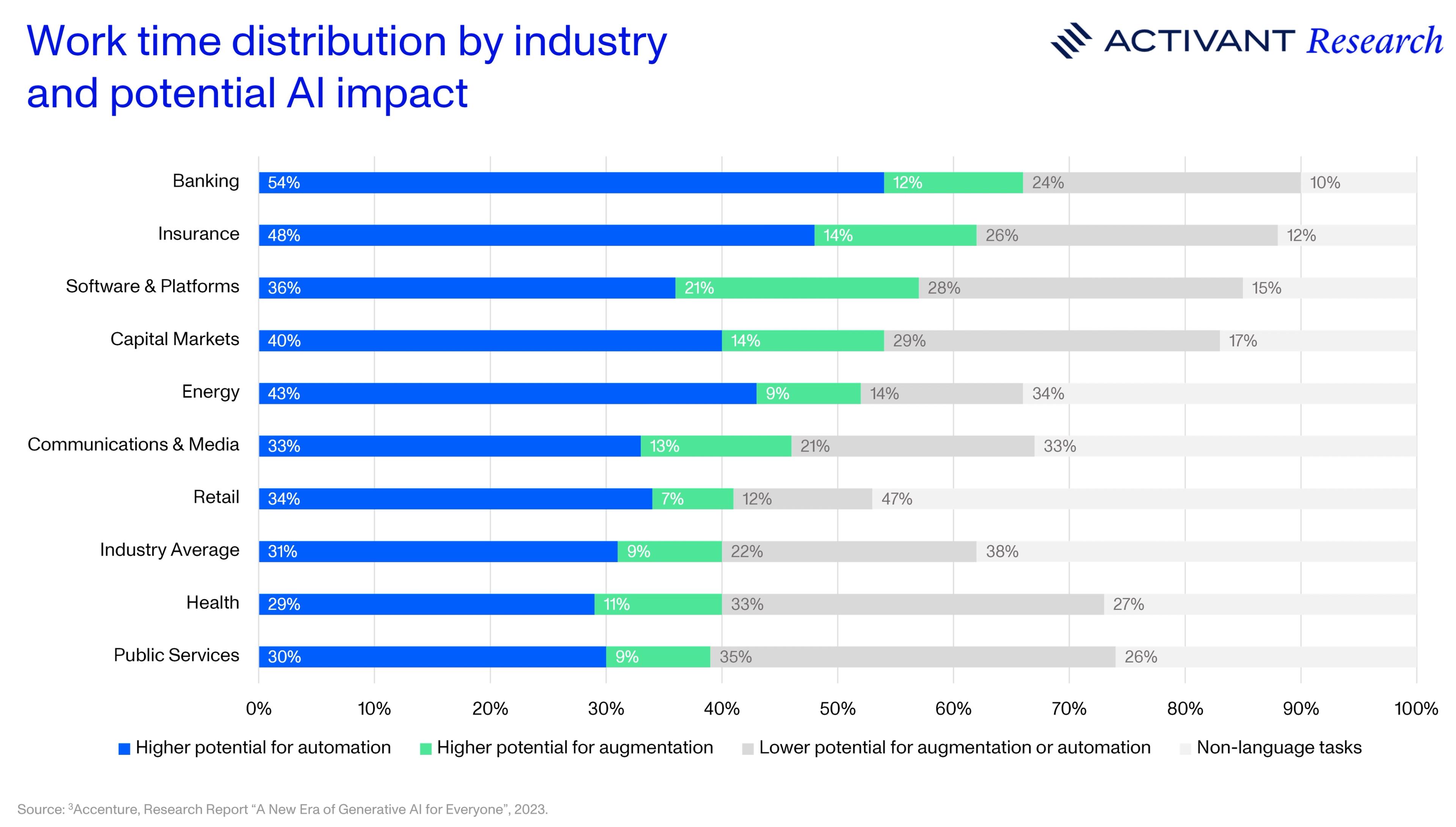 A 2023 study by Accenture on the transformative potential of generative AI in business identified the banking, insurance, software & platforms, and capital markets industries as having the highest potential for automation and augmentation.