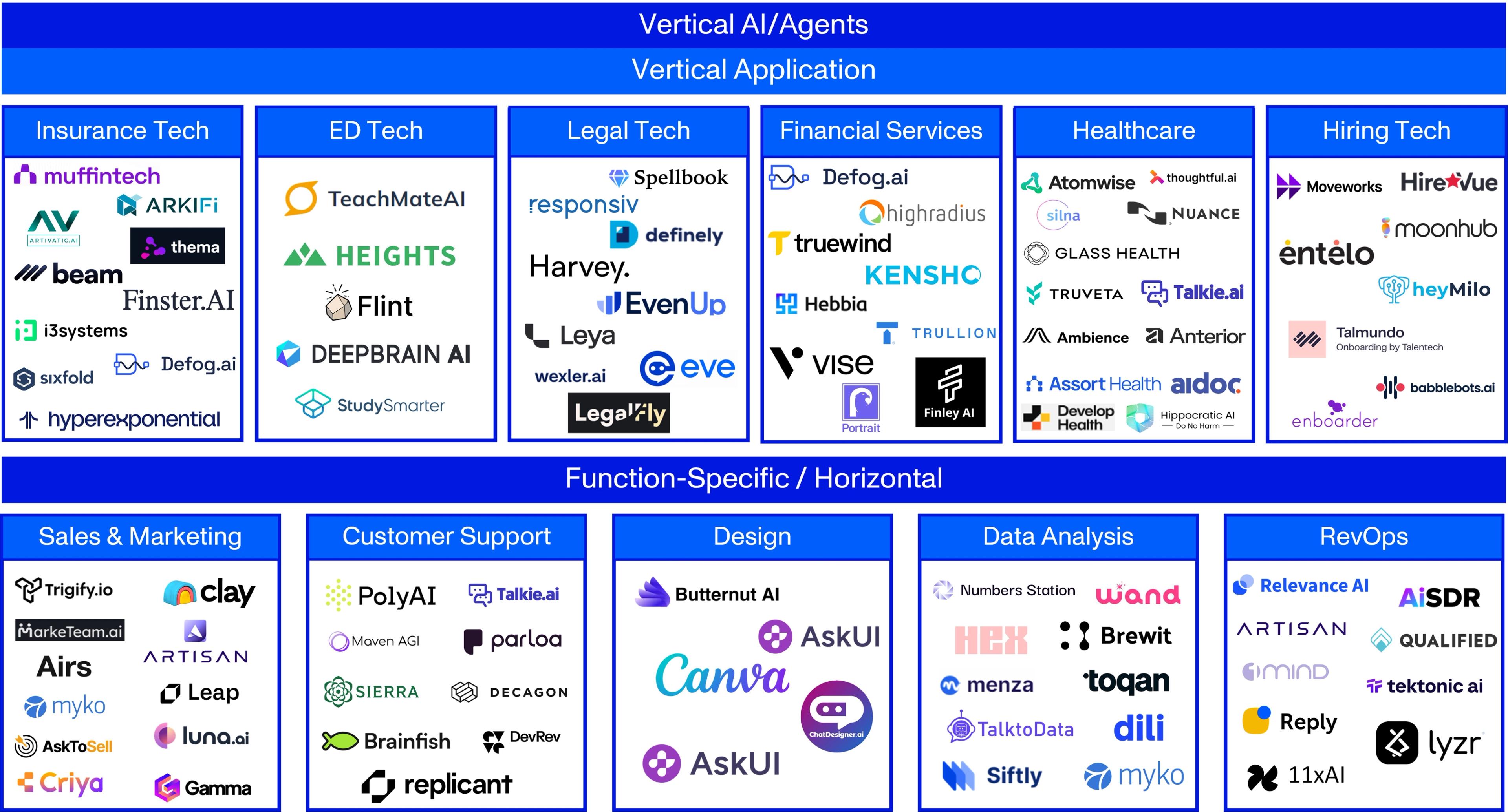 While it took nearly two decades for applications in software to shift from horizontal to vertical, the integration of AI has accelerated this transition. AI-driven vertical solutions have proliferated rapidly due to their ability to leverage industry-specific data. This has led to a surge in demand not just for vertical solutions, but also for company-specific applications.