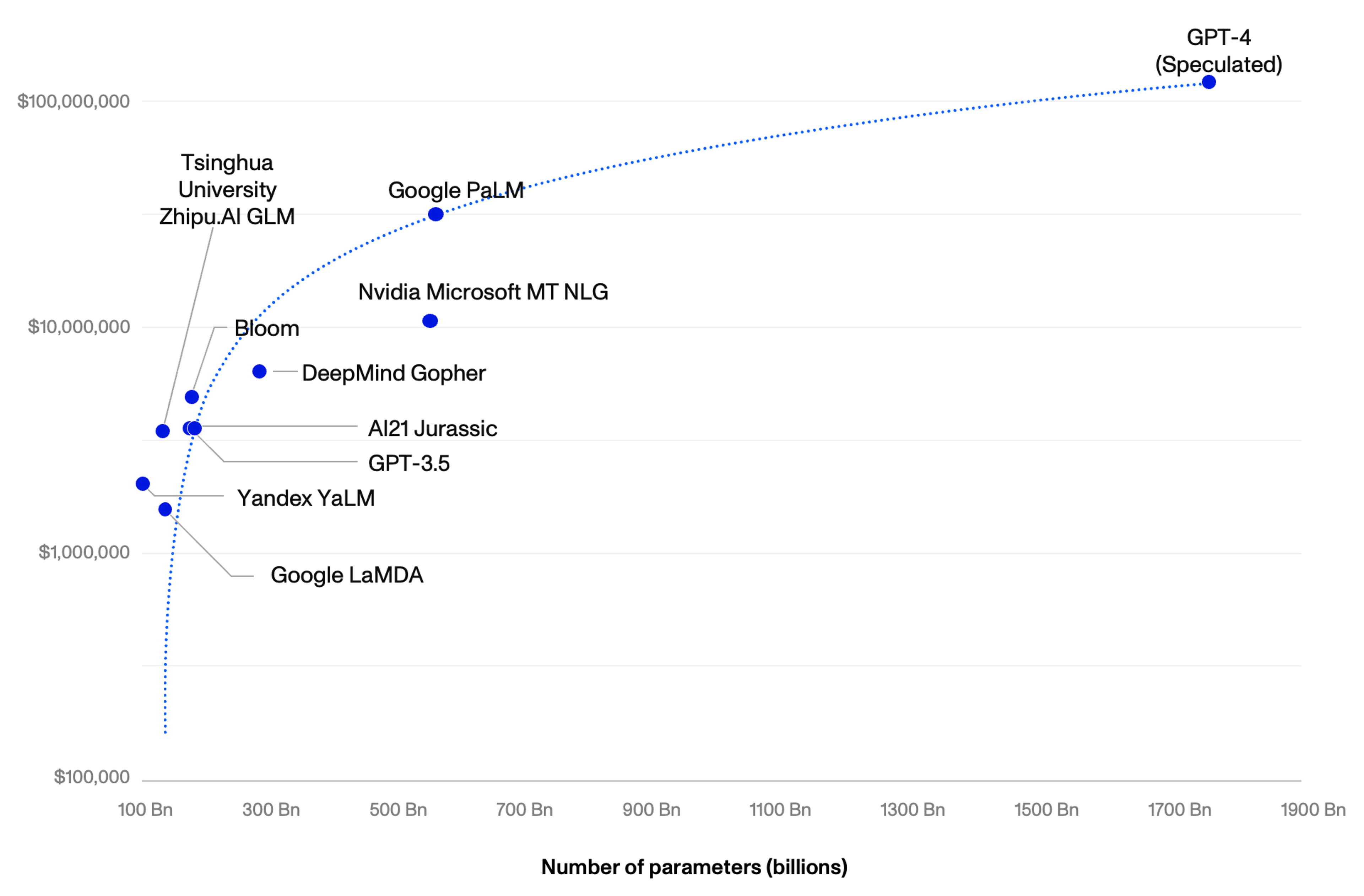 The underlying costs associated with training these models increase exponentially as models get bigger.1 We estimate that OpenAI’s 1.75tn parameter GPT-4 will cost ~$140mn to train, more than 20x greater than its 175bn parameter predecessor GPT-3.5 at $6mn. We further estimate that the subsequent 10x increase in parameters will require $7bn in training costs, $172bn in cumulative hardware, and the equivalent amount of electricity produced by three nuclear plants in a year (~26 000 GWh).2