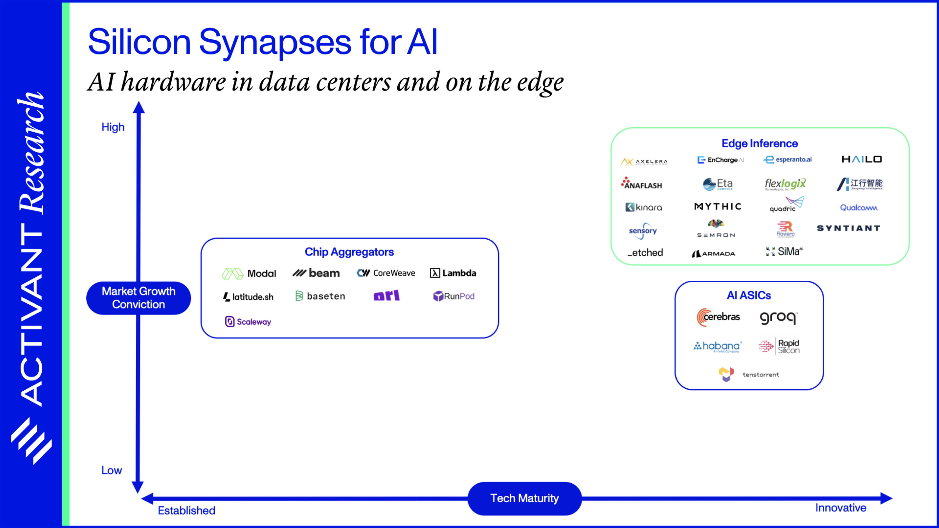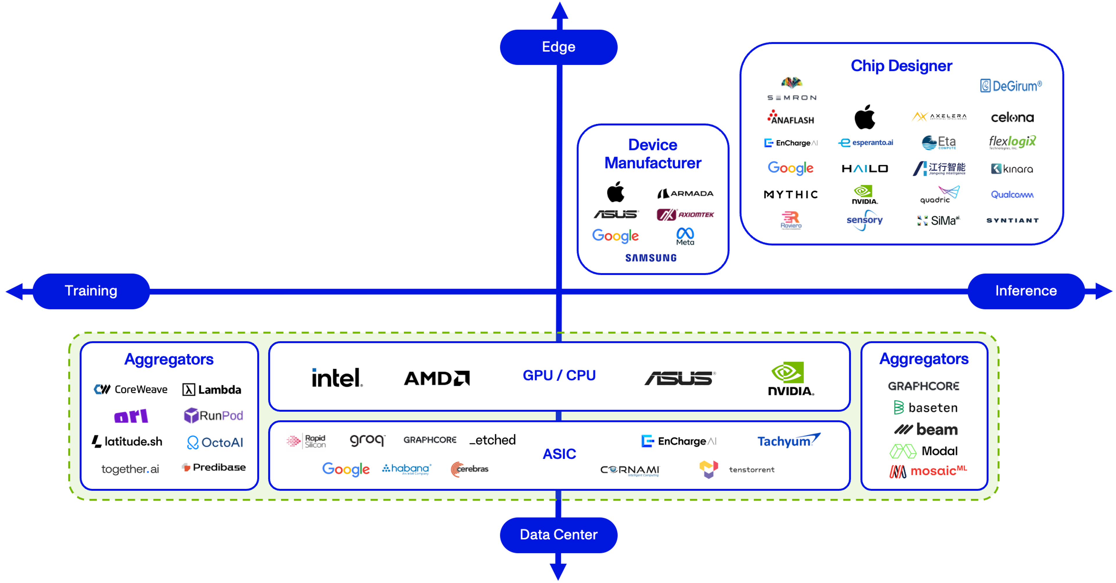 We describe the AI hardware market along the axes of “where the computation is taking place” (y–axis) and “what computation is taking place” (x-axis). We have included a green rectangle that circumscribes what we believe to be a market dominated by NVIDIA, with entry requiring head-on competition with the incumbent.