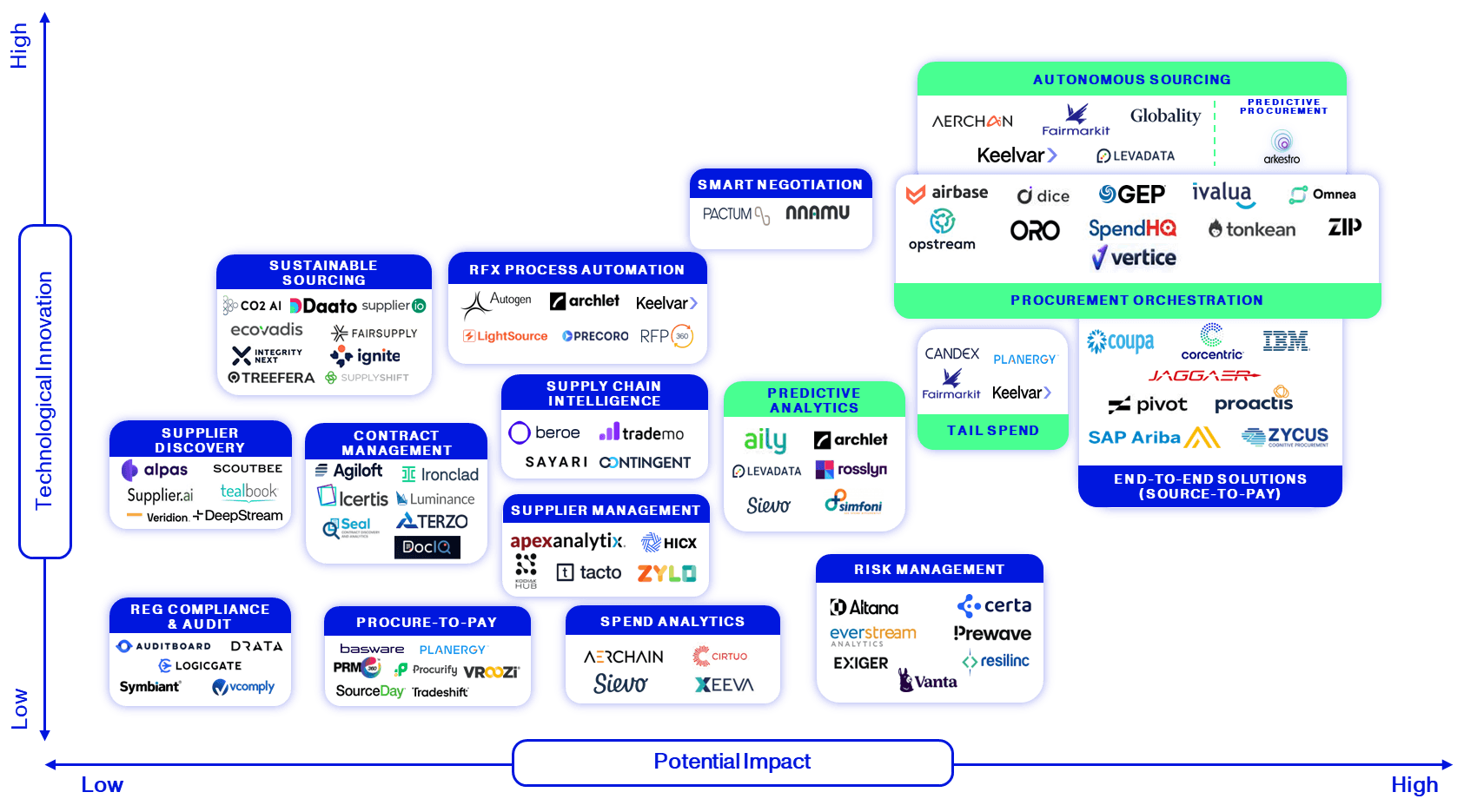 - Procurement Orchestration integrates and coordinates the various tools that each serve a specialized purpose – like supplier discovery, supplier management, and contract lifecycle management – in the procurement tech stack. Most of the orchestration solutions in the market today unify access to data to eliminate the silos that limit efficiency and effectiveness and have intuitive user interfaces that focus on customer needs. Almost all use AI to streamline processes and automate routine tasks. This enables data-driven decision making and, over time, a shift to AI-supported or autonomous sourcing. All of the logos shown on the thesis map have interesting offers but we particularly like the solutions provided by Zip, Dice and ORO. Vertice has an effective solution targeting SaaS and cloud costs, while Omnea has had similar impact with software spend and renewals. All the players in this segment are worth looking at.