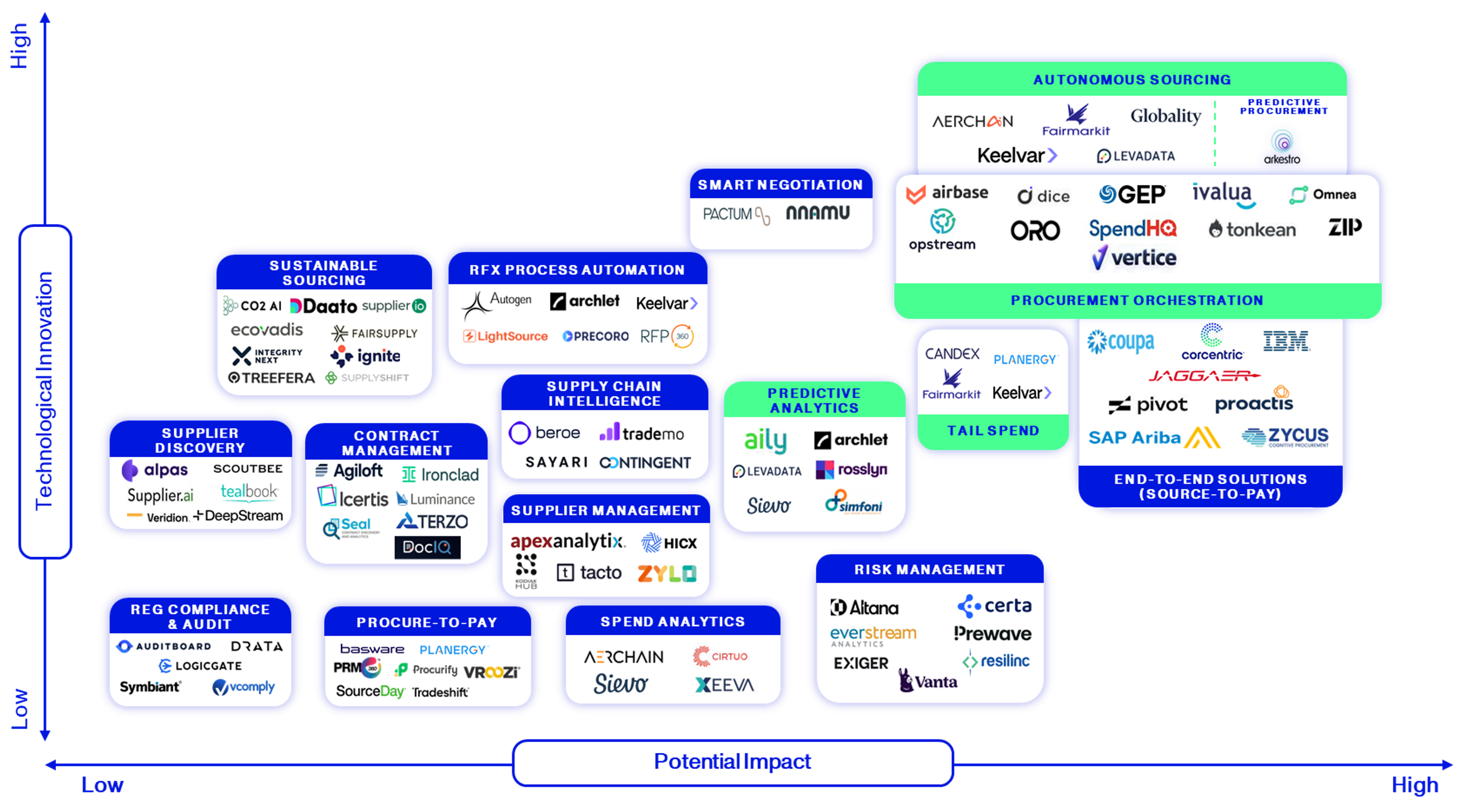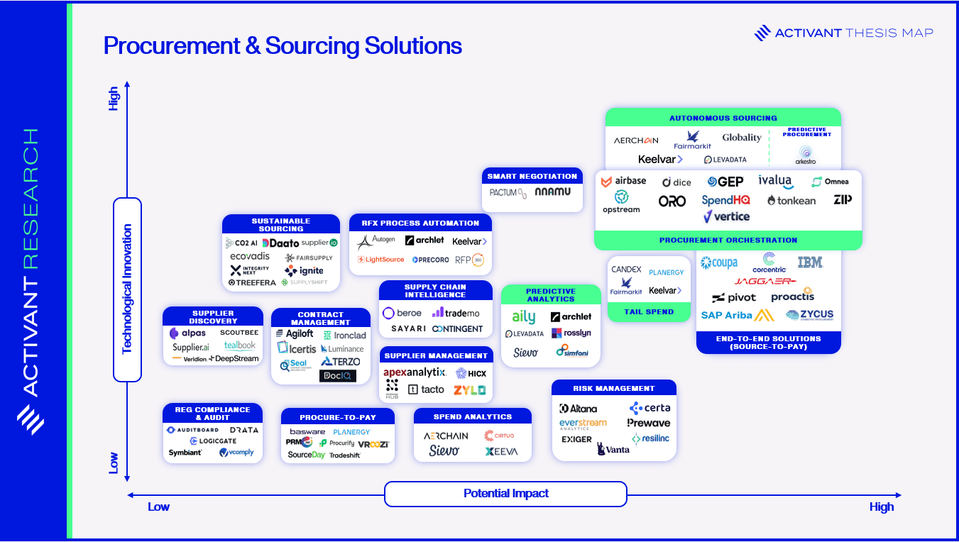 Building on the simple segmentation of the value chain view, we crafted a thesis map to guide Activant’s investment considerations by mapping our view of the tech innovation required and the potential impact that the solutions can deliver. When viewed this way, we are most excited about the potential for payment orchestration players, autonomous sourcing solutions that are in the very early stages of development, predictive procurement, predictive analytics, and tail-spend management solutions that can deliver savings in an area that has historically been poorly controlled because of the large number of vendors and smaller invoices. There are, however, distinctive and novel solutions across the spectrum with many startups challenging the status quo.