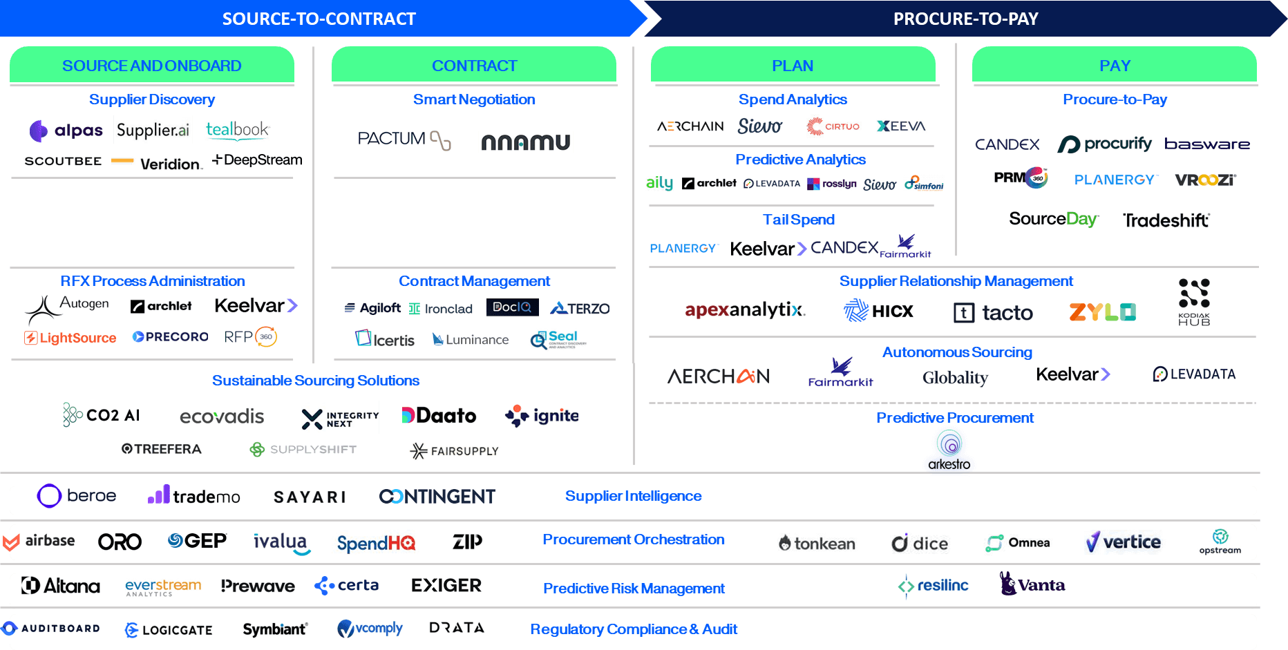 The simplest way to map any landscape is to start with the value chain. There are many ways to think about the flow, but we found it easiest to think about the “source-to-contract” and “procure-to-pay” tasks, and then to focus on the discrete steps within each. Within each of these discrete steps we can identify some of the key players and those newer entrants offering unique or novel solutions.
