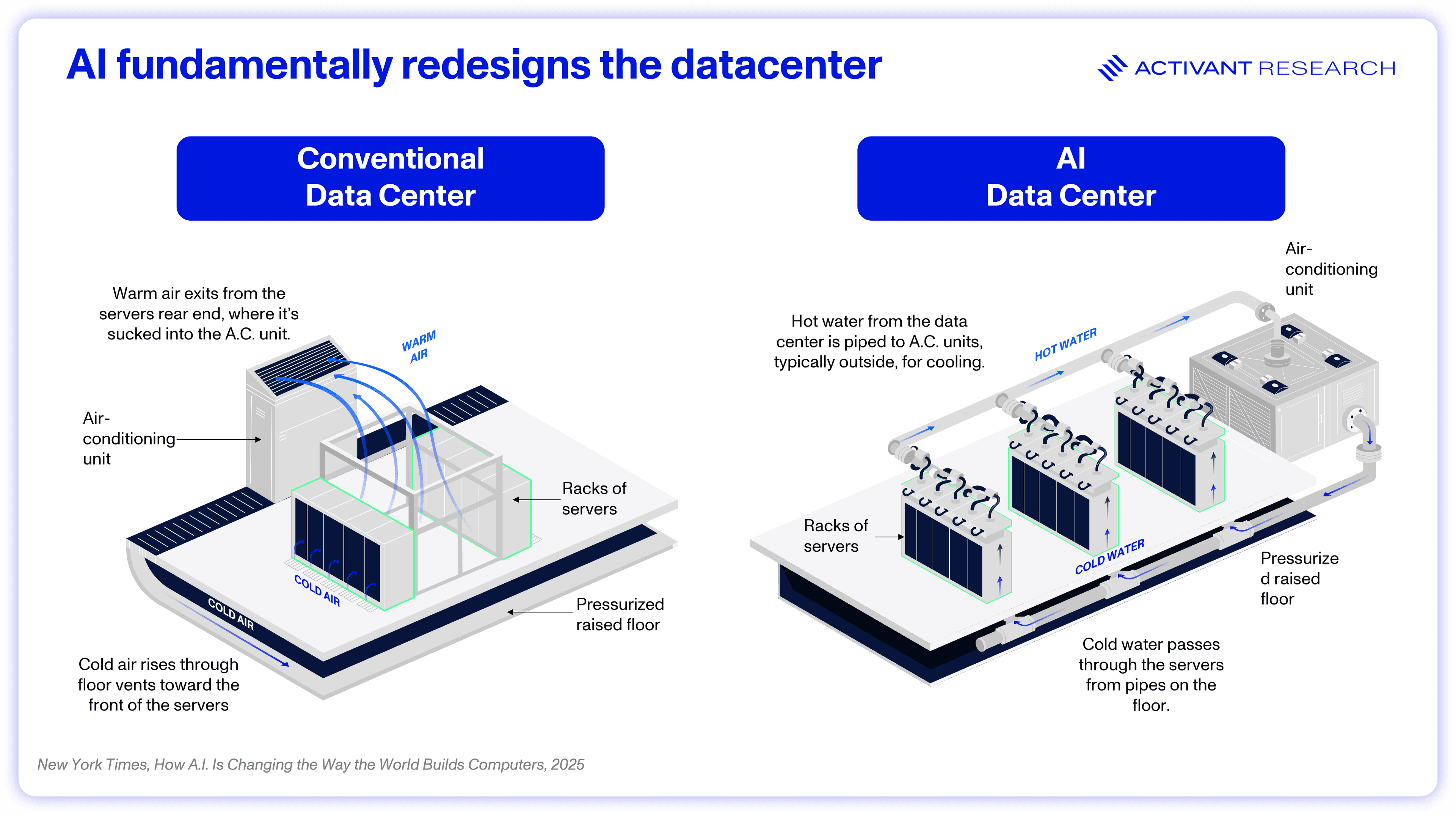 These GPU-based server racks consume far more power and thus generate far more heat than CPU racks – 3x as much, and potentially ~50x as much when Nvidia’s Rubin Ultra System is released.8,9 At these power densities, air-cooled GPU server racks would melt and instead require liquid cooling. These liquid cooling systems take up significant floorspace and can’t be stuffed into tightly packed CPU-heavy datacenters.