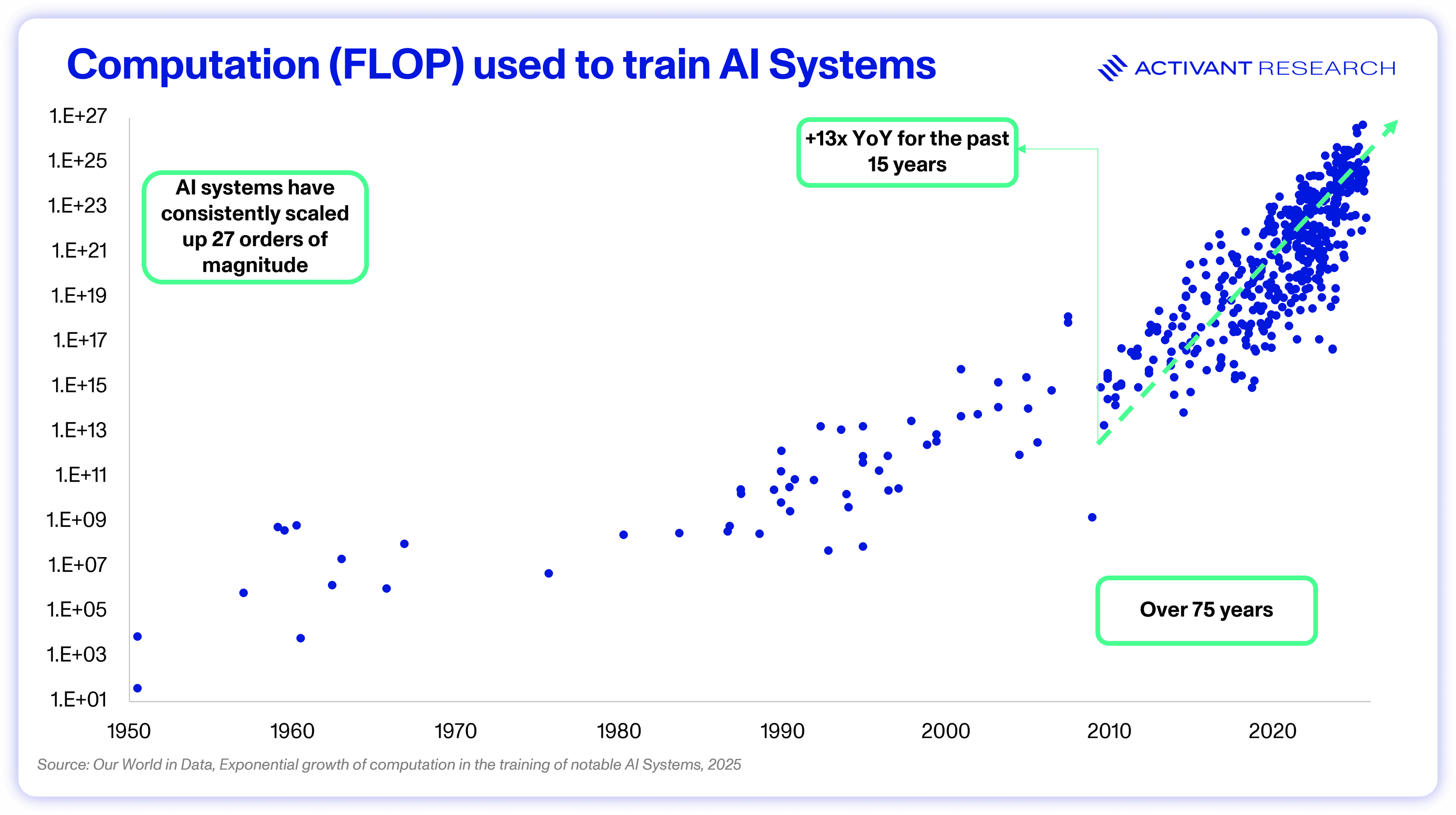 Our analysis, however, suggests the build-out is both rational and supported by highly favorable early fundamentals. What we’re experiencing is a logical response to the core insight of modern AI: the more computing power you apply, the better the model (or system) performs, and that next step up in performance might unlock not just automating route work but a cure to cancer or nuclear fusion.