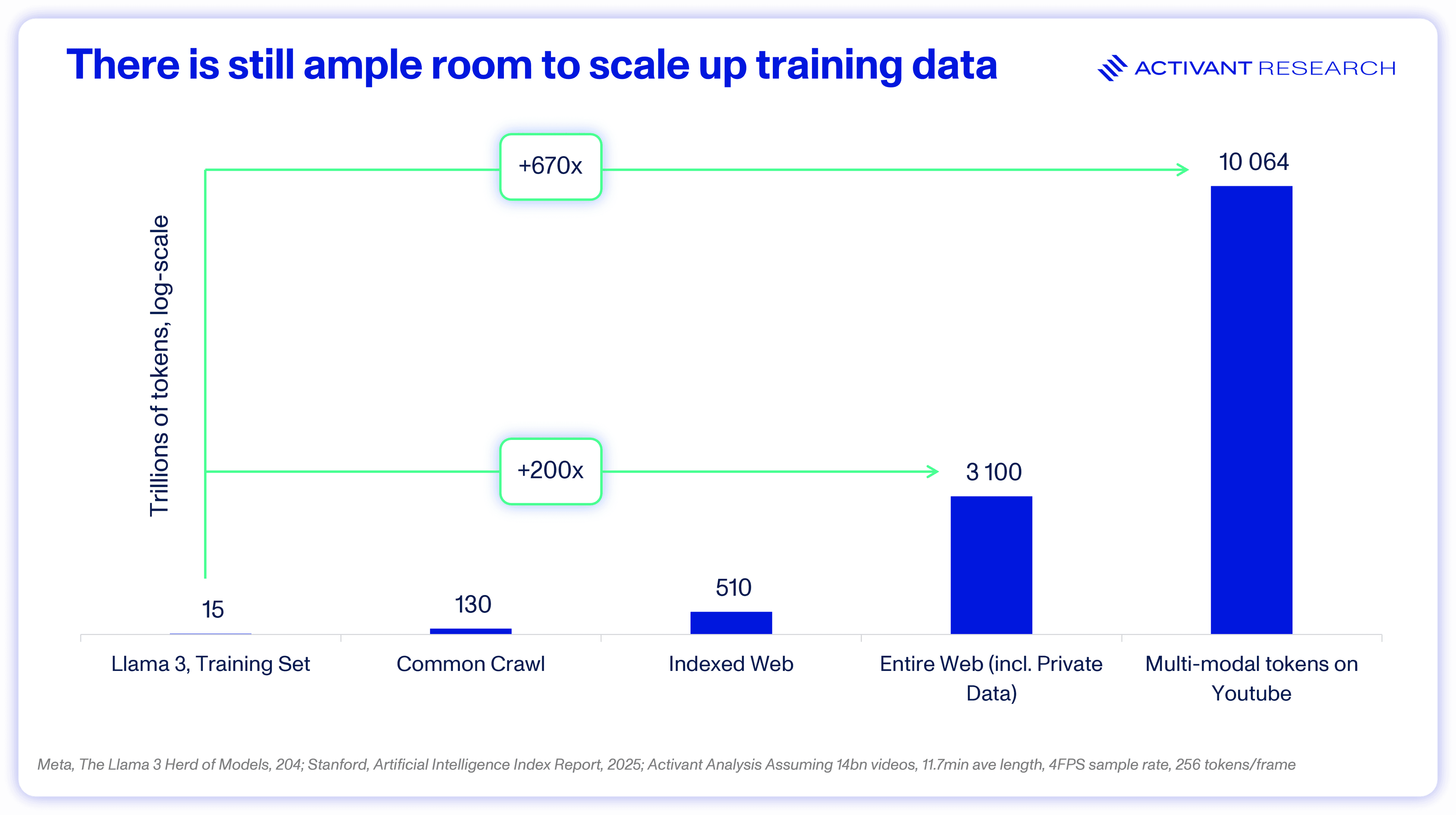 The primary concern that AI models will run out of data arises from the common claim that leading models were trained on “the entire internet”. Luckily, its false. Llama 3 has the largest published dataset size at 15 trillion tokens: a selectively filtered and high quality subset of the ~130 trillion tokens available on common crawl.31,32 When we consider the entire size of the available web, images and video, there’s an opportunity for another ~200x scale up, ignoring the fact that the web is still growing exponentially.33 Further, most estimates of the token contribution from video content assume transcription of text. However, multi-modal models can be trained on the video data itself, where there may be an extra ~10 quadrillion tokens on YouTube alone.34