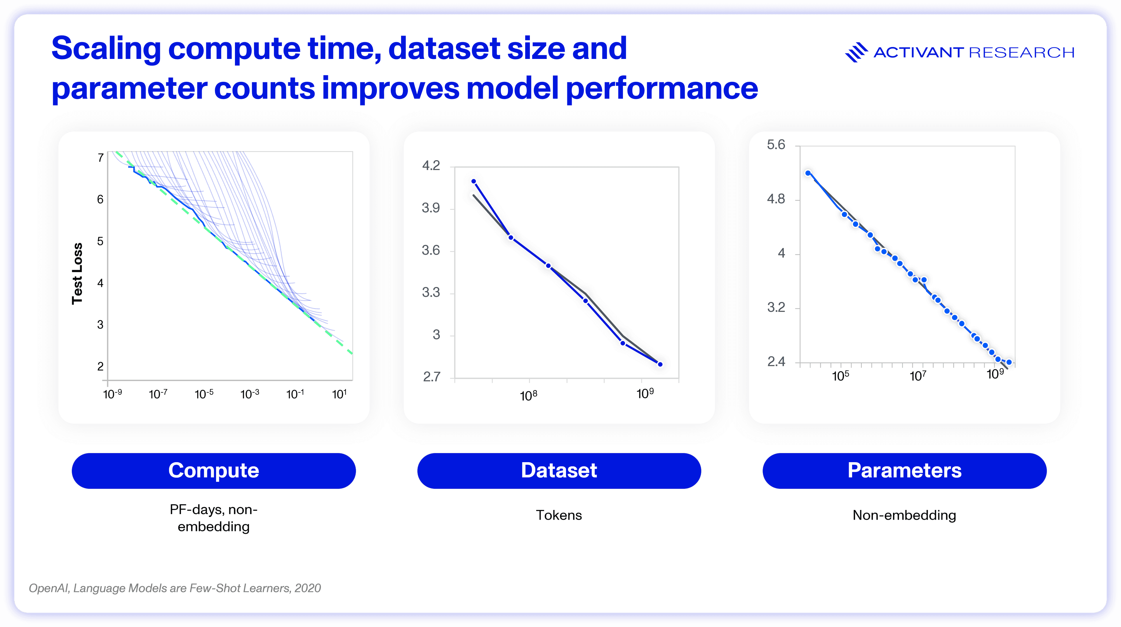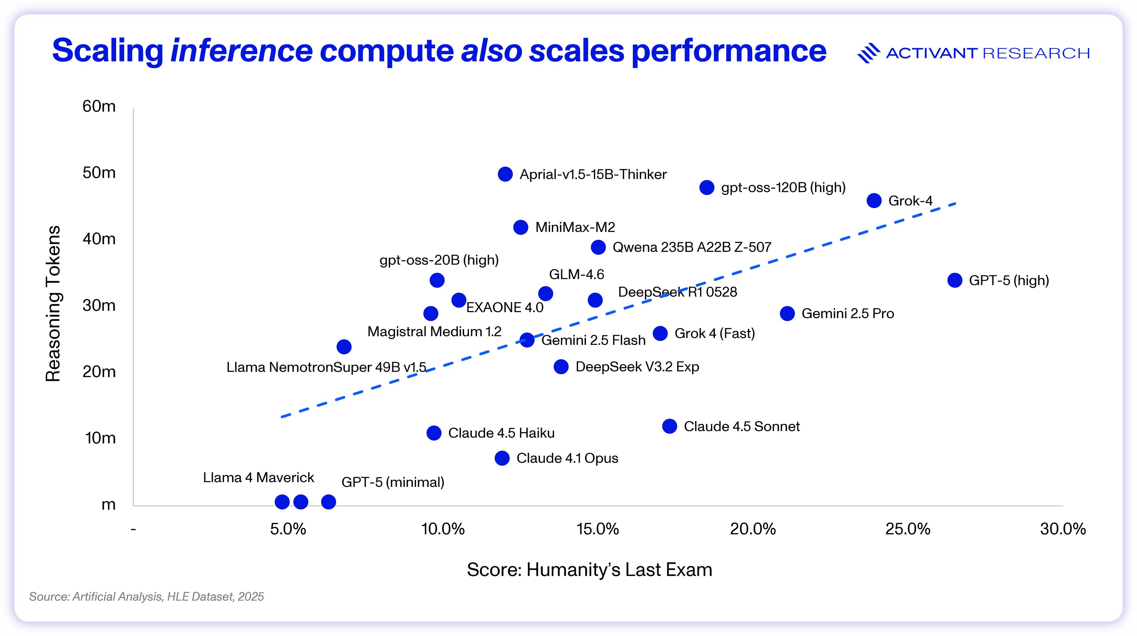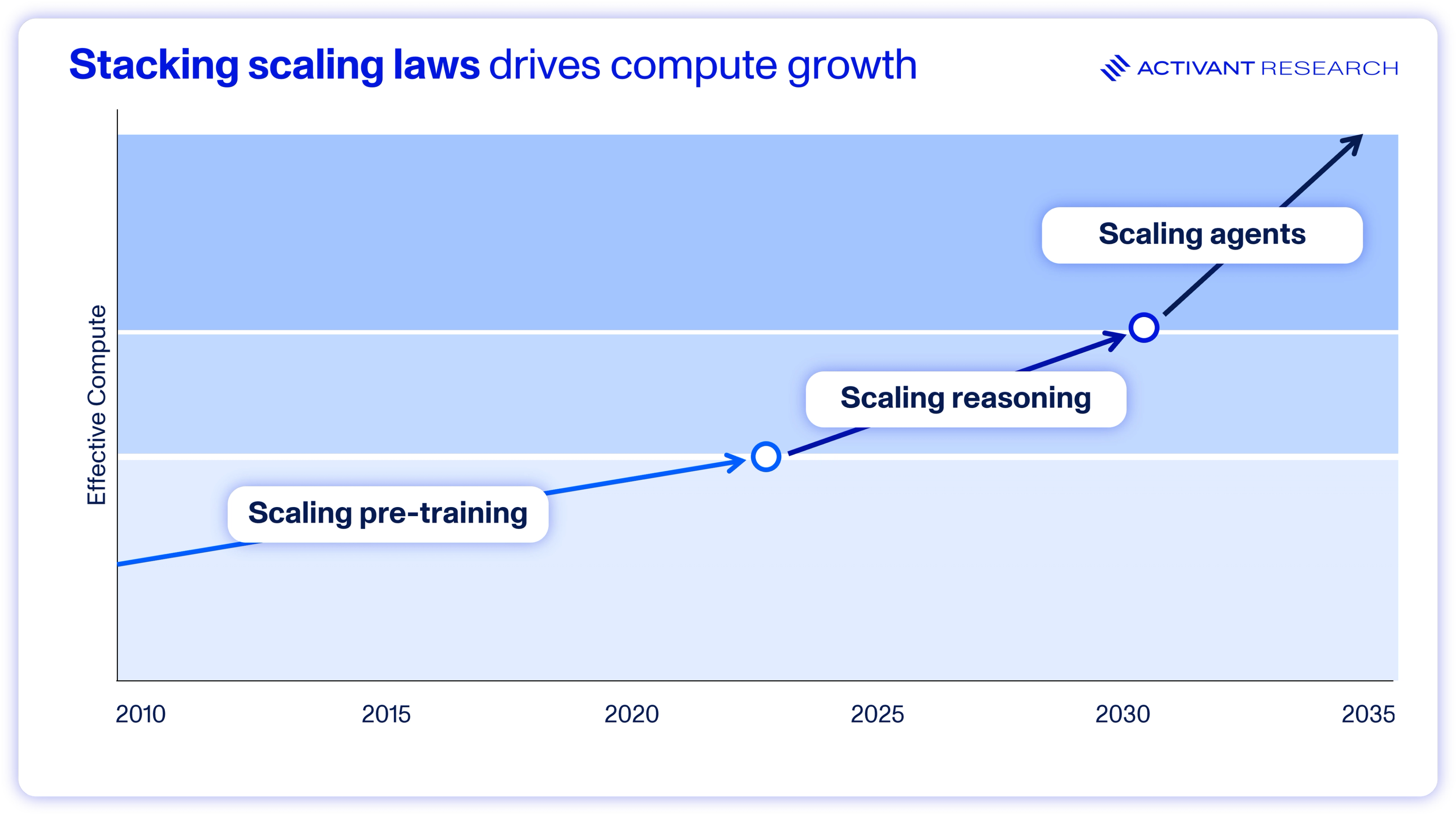 Rather than simply making the model bigger, the next decade will be defined by a more nuanced approach of optimizing the balance between pre-training and test-time scaling. And at Activant, we see a third vector of scaling, not necessarily in the control of model builders, but driving the demand for compute all the same.