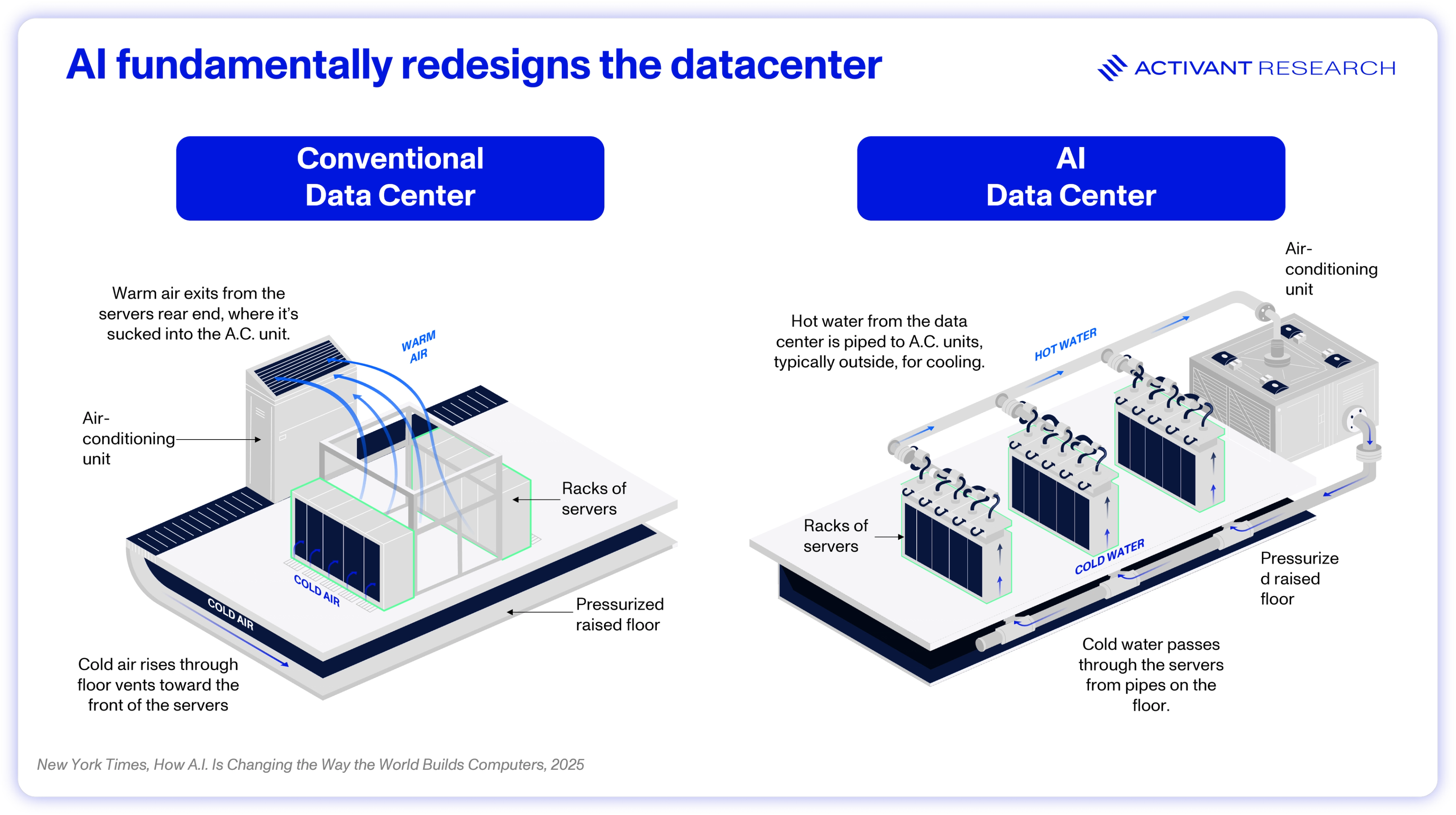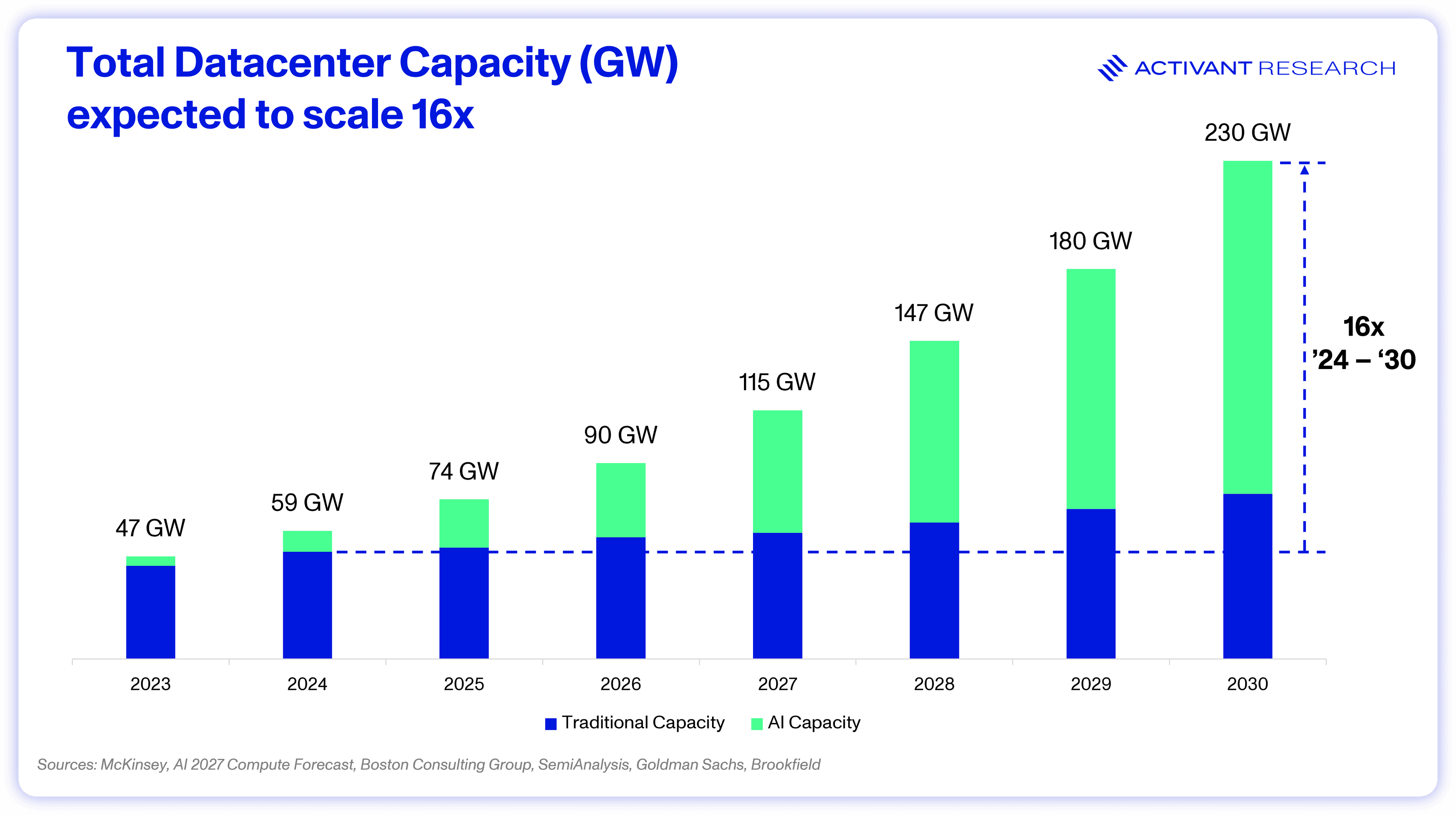 AI makes up only 30% of total datacenter capacity today, with close to 70% still tied to traditional workloads.10 For AI to both continue improving and deeply penetrate the entire global economy, we see that ratio inverting. However, we clearly can’t retrofit the existing datacenter infrastructure for AI. We’re going to need entire datacenters that are specialized for AI – architected around GPUs, not CPUs, liquid cooled and networked for ultra-low latency.