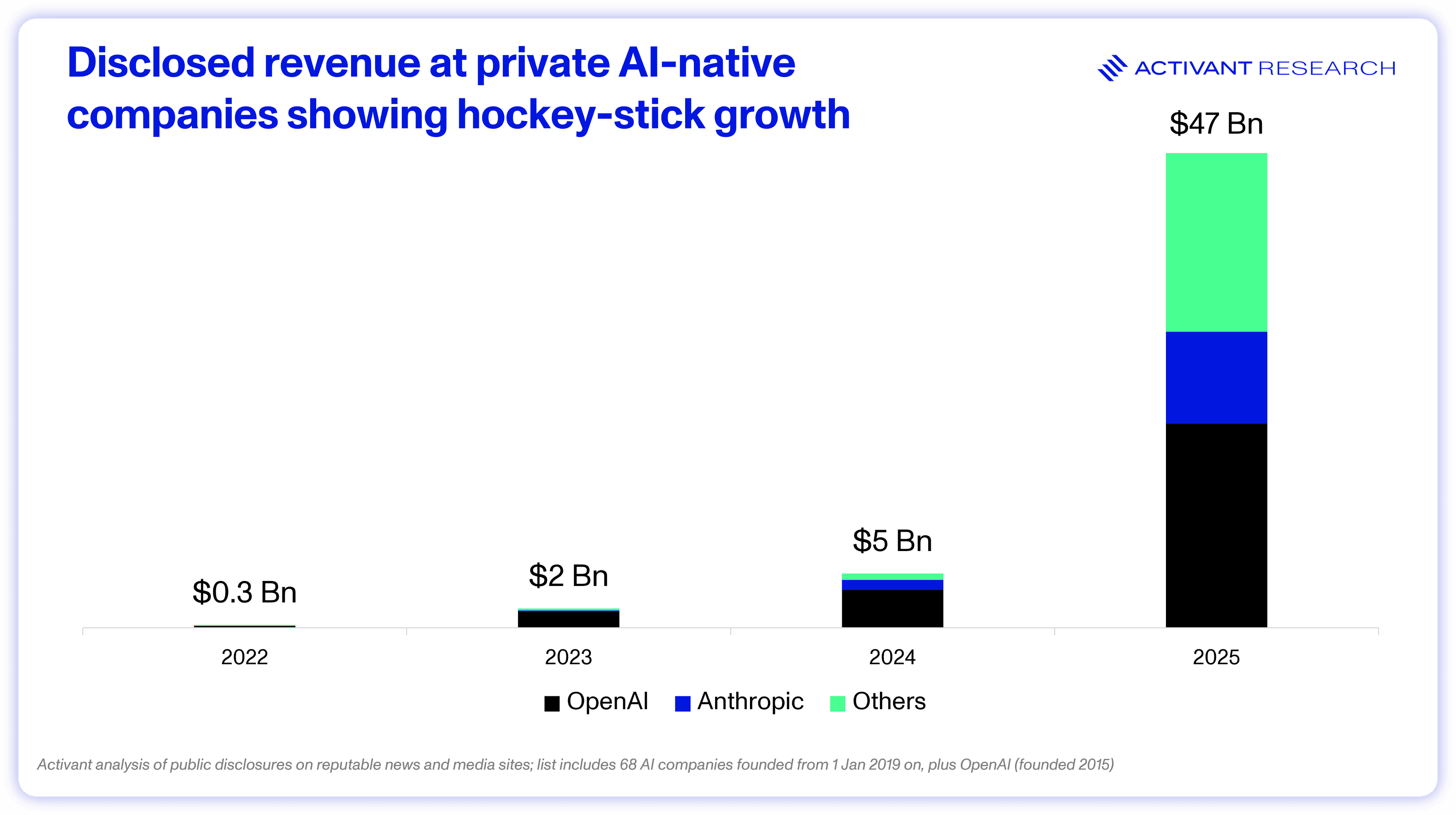 Further, demand for AI computing is not just theoretical. The hyperscale compute providers persistently describe demand as "significantly ahead of supply" and their own businesses as "compute starved". Companies like Google and Meta are deploying AI to billions of users and finding incremental revenue opportunities even at their $100bn+ revenue scale, almost immediately validating their headline-grabbing capex figures. Simultaneously, a new wave of AI-native startups is generating real revenue: going from $5bn to $47bn in ARR in the last year.2