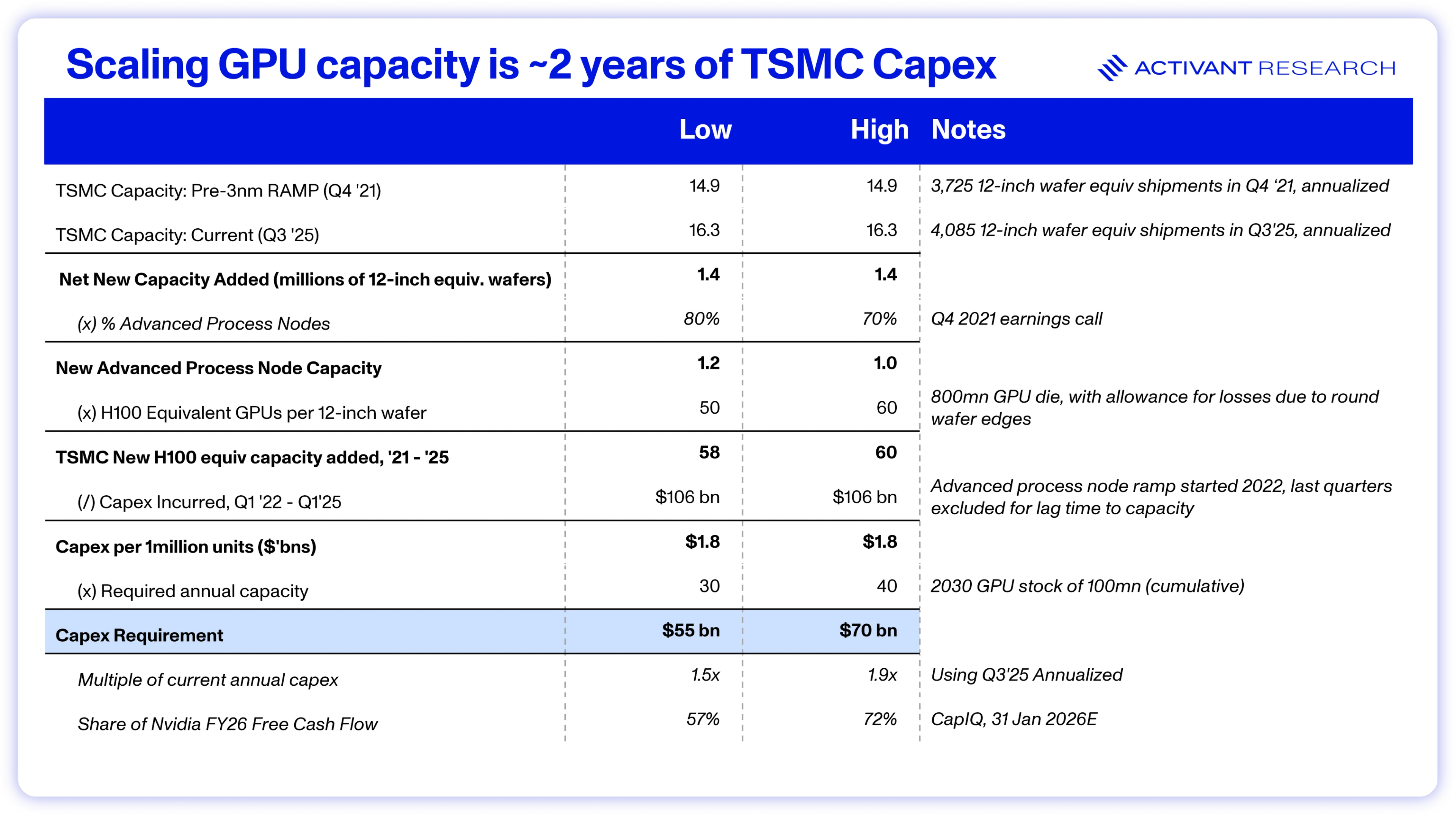 Its estimated that GPU stock needs to reach 100 million H100-equivalent units by 2030 for scaling to continue.39 We estimate that this would require an additional annual capacity of 30 – 40 million units and cumulative capex of $55bn - $70bn, only 1.5x to 2x TSMC’s current annual capex and less than Nvidia’s FY26E Free Cash Flow.40 The reality is that GPUs are still a small portion of leading-edge semiconductor capacity and fabs are unlikely to be the constraint that halts scaling.