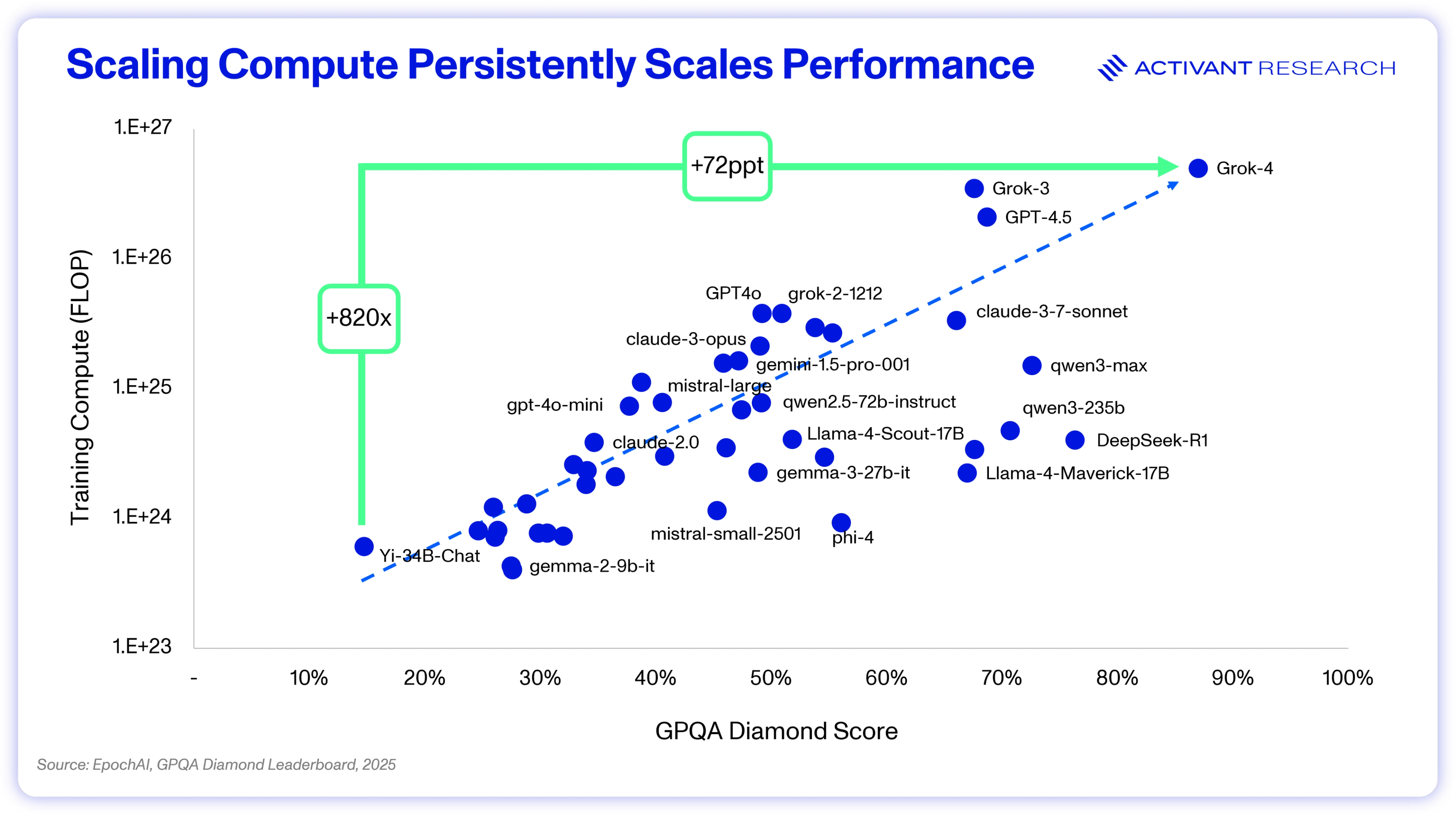 Scaling up compute may be capital intensive, but it is predictable and repeatable. Unfortunately, it demonstrates diminishing returns. Doubling compute does not provide a doubling of performance, rather, each order of magnitude increase in compute drives model performance. Note the scaling of GPQA performance above – it took an 820x increase in compute to move from a score of 15% to 87%. GPUs and algorithms enhance efficiency at ~2x per year combined, which leaves the 10x, 100x, and 1,000x scale-ups being driven by building more datacenters.14 And that work is worth it, thanks to generalizability.