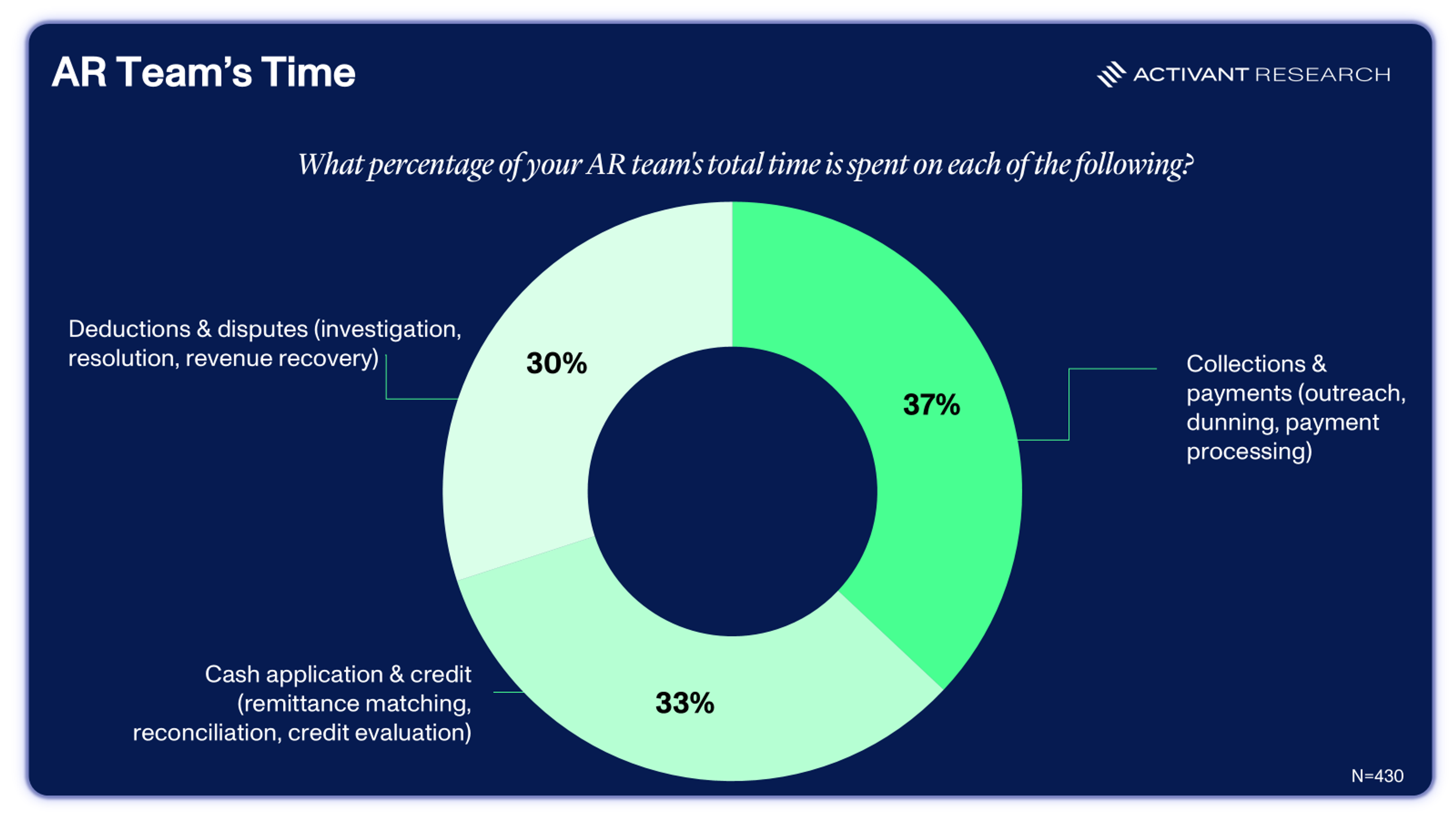 AR teams are stretched thin across the board, and the data shows it. Time is split almost evenly across three major workstreams: collections and payments (37%), cash application and credit (33%), and deductions and disputes (30%). No single activity dominates, so no single automation unlocks meaningful time savings.