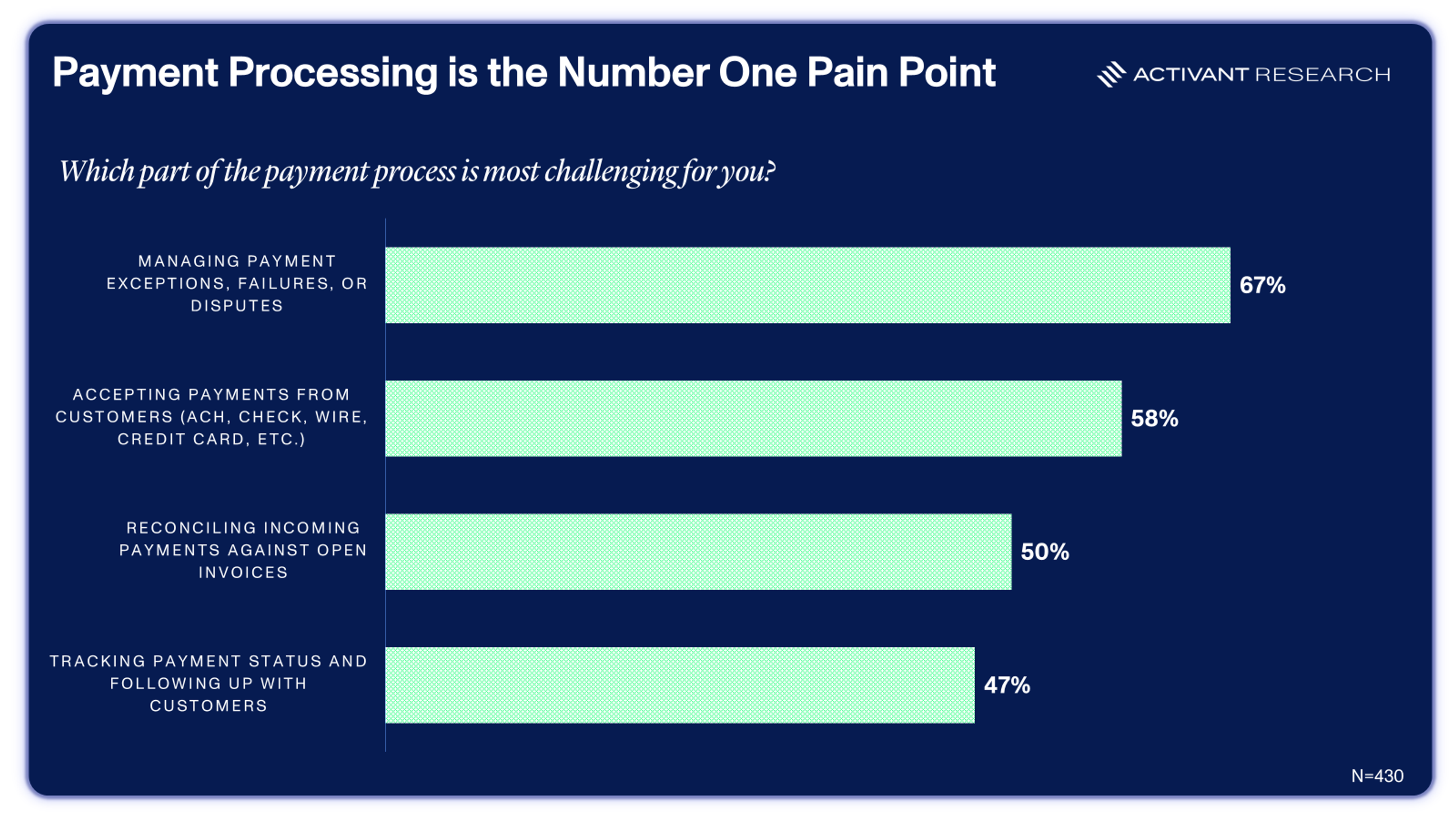 Zoom in on any one of those workflows and the same pattern emerges: the pain concentrates around exceptions. Within payment processing, 67% of respondents who flagged it as a top friction area cite managing exceptions, failures, or disputes as the hardest part. Accepting payments across multiple formats (ACH, check, wire, credit card) followed at 58%, with reconciling incoming payments against open invoices at 50%.