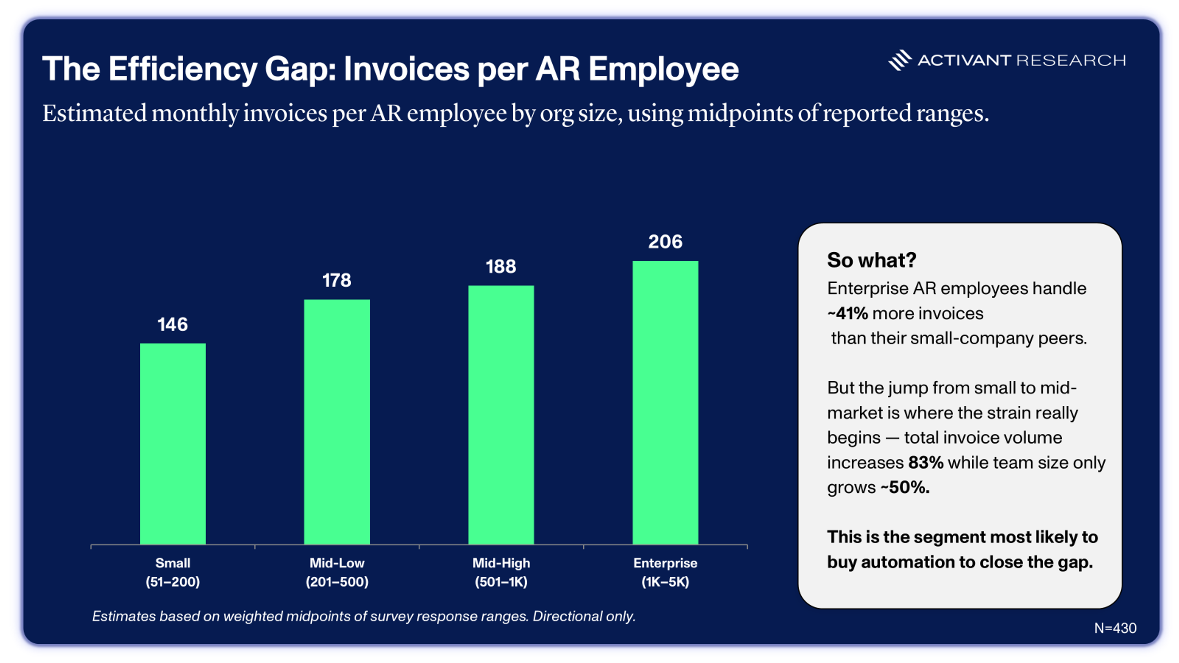 The crunch is worst in the mid-market. As companies grow from small (51-200 employees) to mid-market (201-500 employees), invoice volume jumps roughly 83%, but AR headcount only grows about 50%. Workload rises steadily per person: from around 146 invoices per AR employee per month at small firms, climbing to 206 at enterprise scale (1-5K employees). By then, each AR employee is handling about 41% more invoices than their counterpart at a smaller company. The mid-market sits at the inflection point where manual processes begin to crack under volume pressure and the ROI case for automation is most acute.