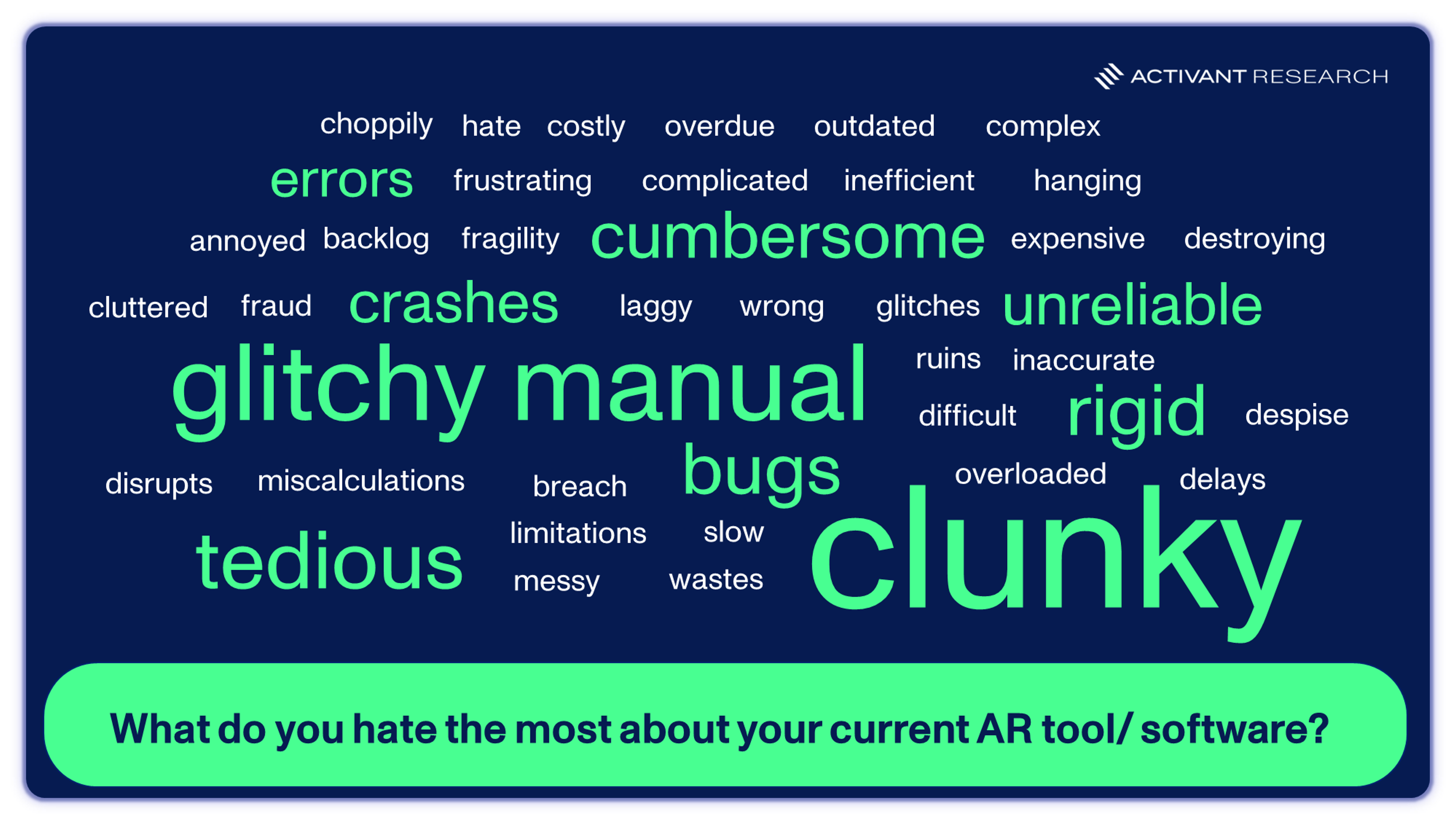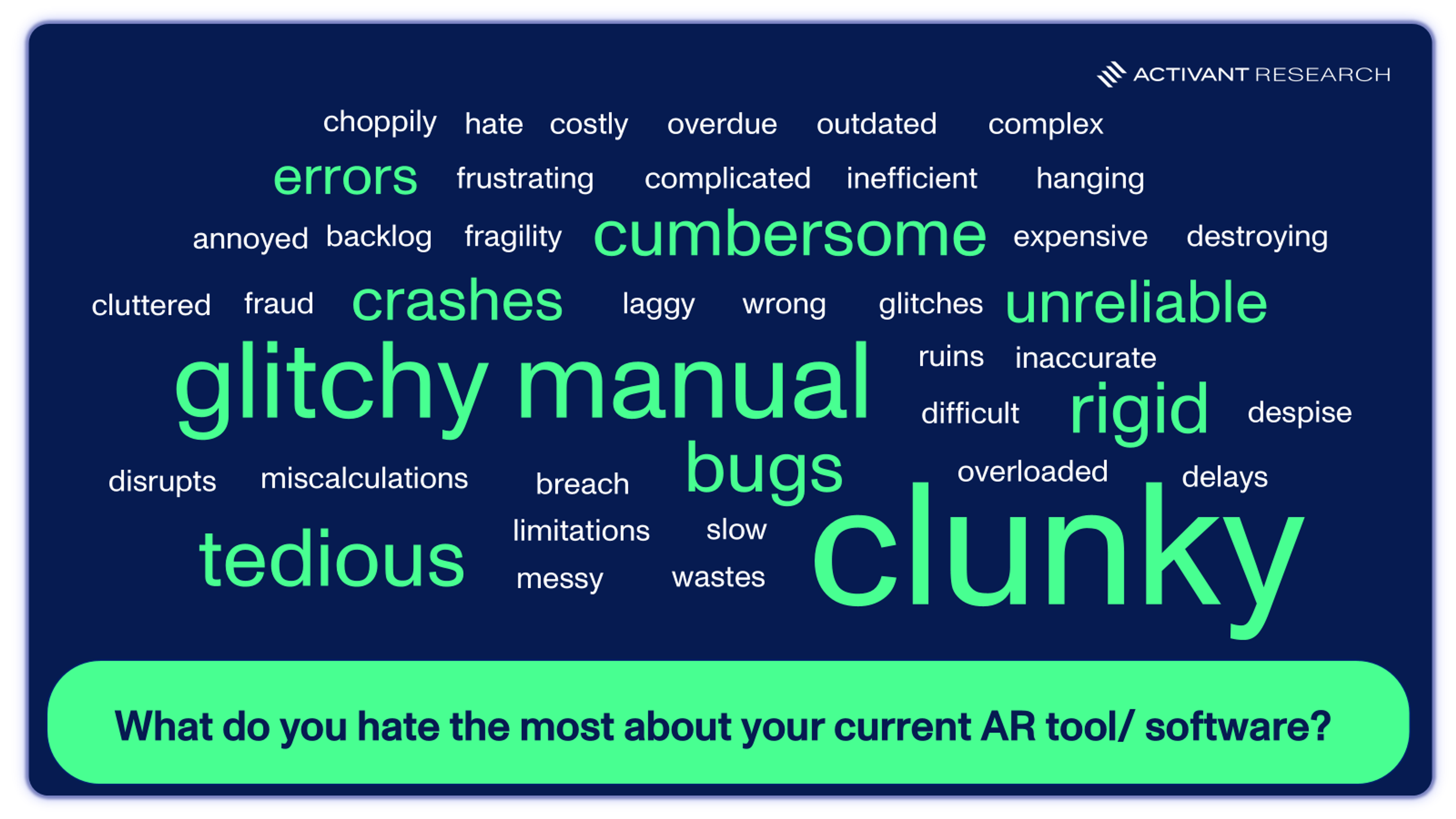 - Satisfaction is a mirage. 84% of respondents rate their current AR tool a 4 or 5 out of 5, but only 32% stay because the product works well. The other 68% are held back by budget constraints, deep ERP integrations, switching costs, and vendor lock-in.