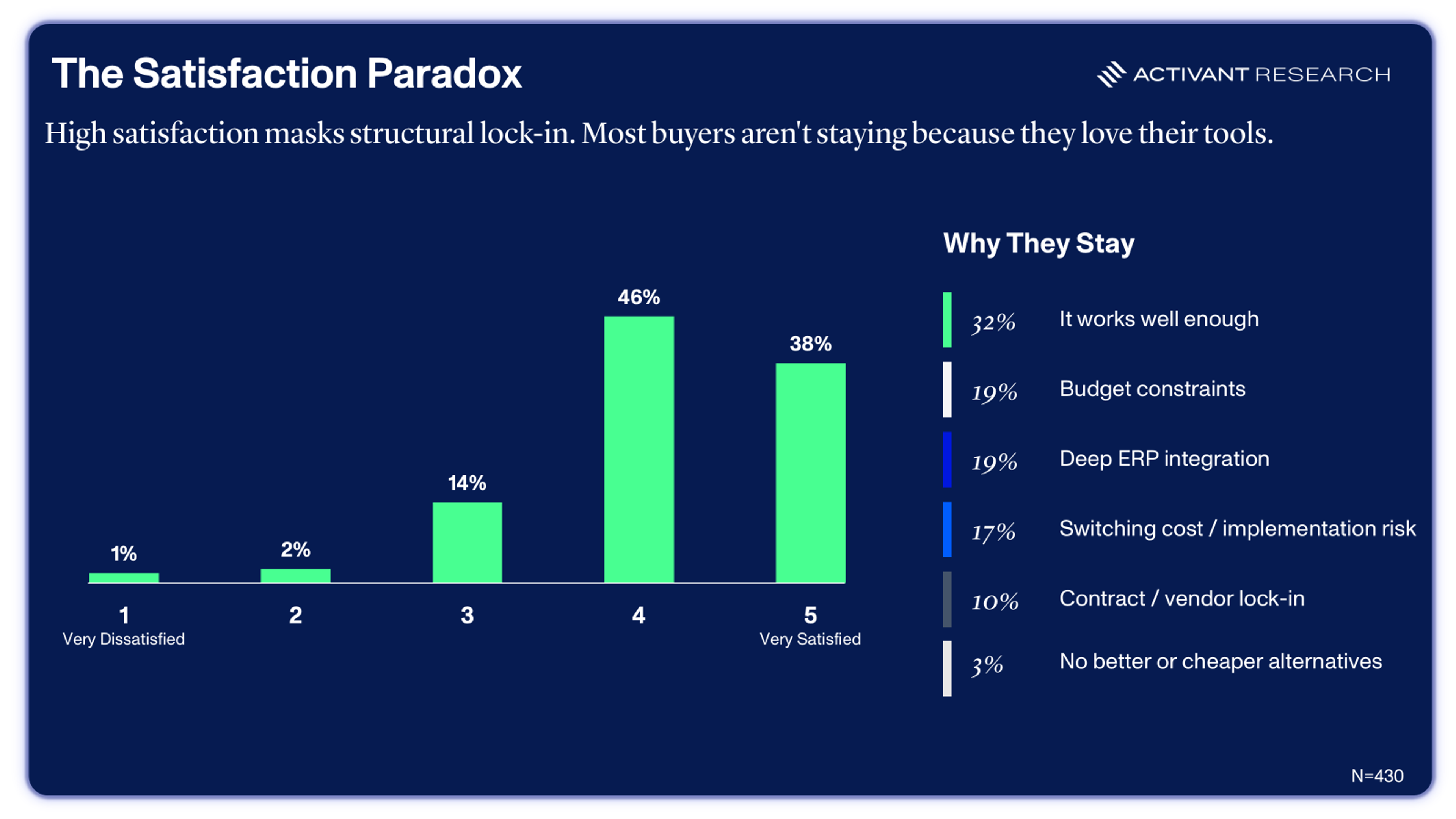 This is a market of captive, not contented, customers. High satisfaction scores mask a buyer base that would move if someone lowered the friction of switching. That distinction matters enormously for how we think about competitive dynamics, go-to-market strategy, and where venture capital should flow in the order-to-cash stack.