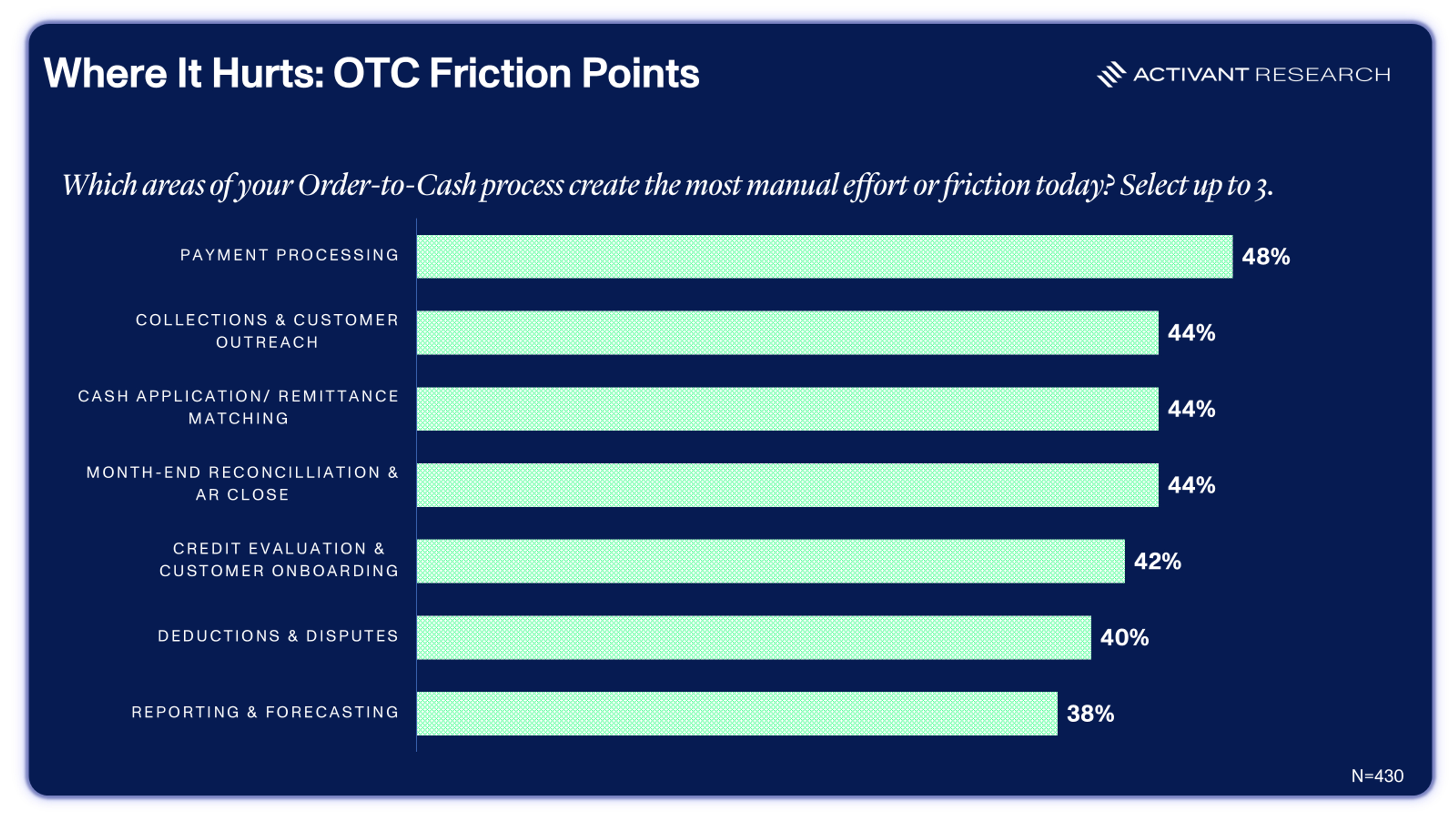 The problem isn't just that there's more work. It's that the work is scattered. When asked to identify the areas of their order-to-cash process that generate the most manual effort and friction, payment processing topped the list at 48% followed by a three-way tie at 44% across collections and customer outreach, cash application and remittance matching, and month-end reconciliation. Deductions and disputes follow closely at 40%, with reporting and forecasting at 38%. The tight spread tells us that friction is systemic, not localized. AR teams are not fixing one broken process; they are managing a portfolio of partially automated workflows, each demanding human intervention at the edges.