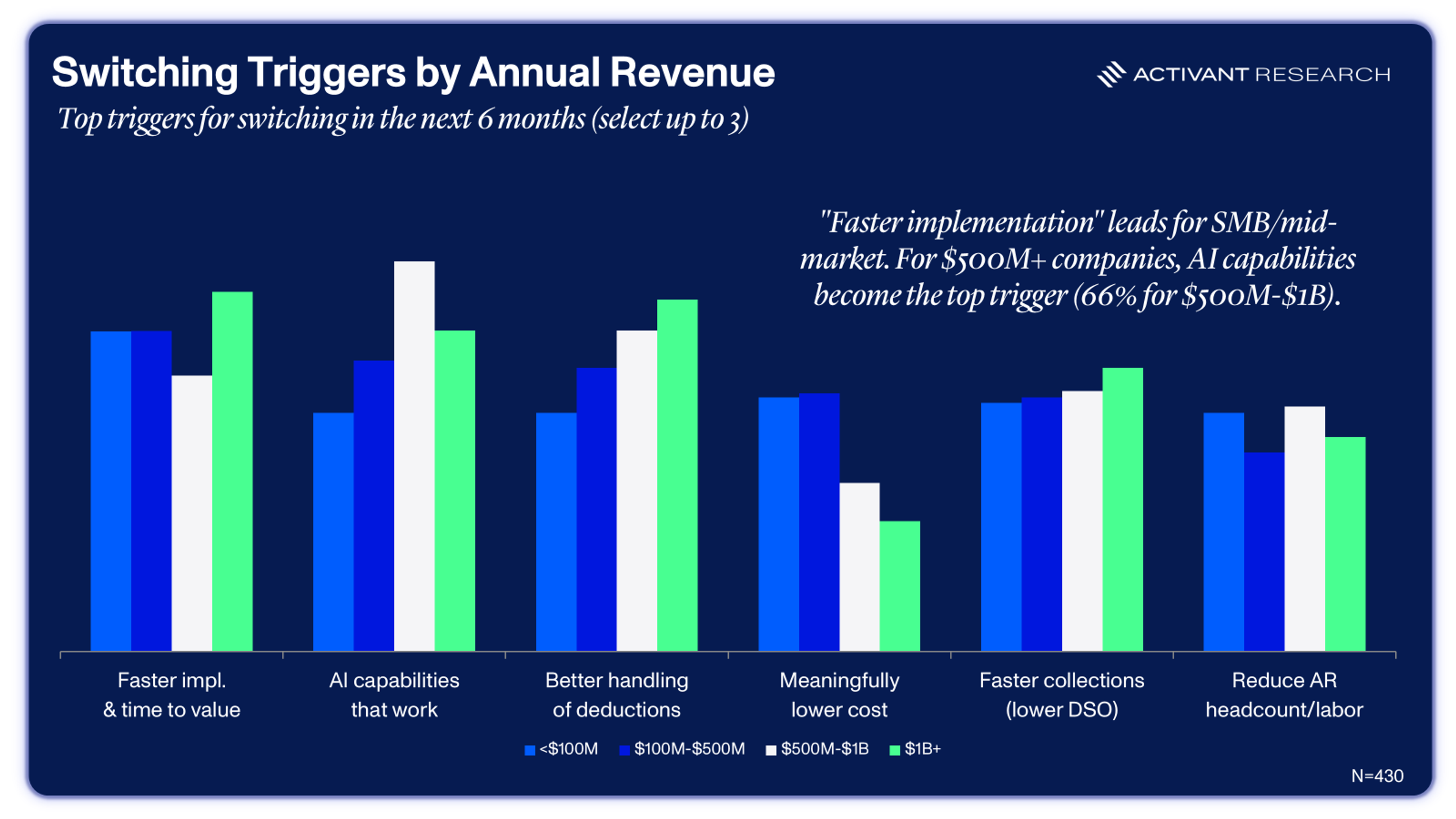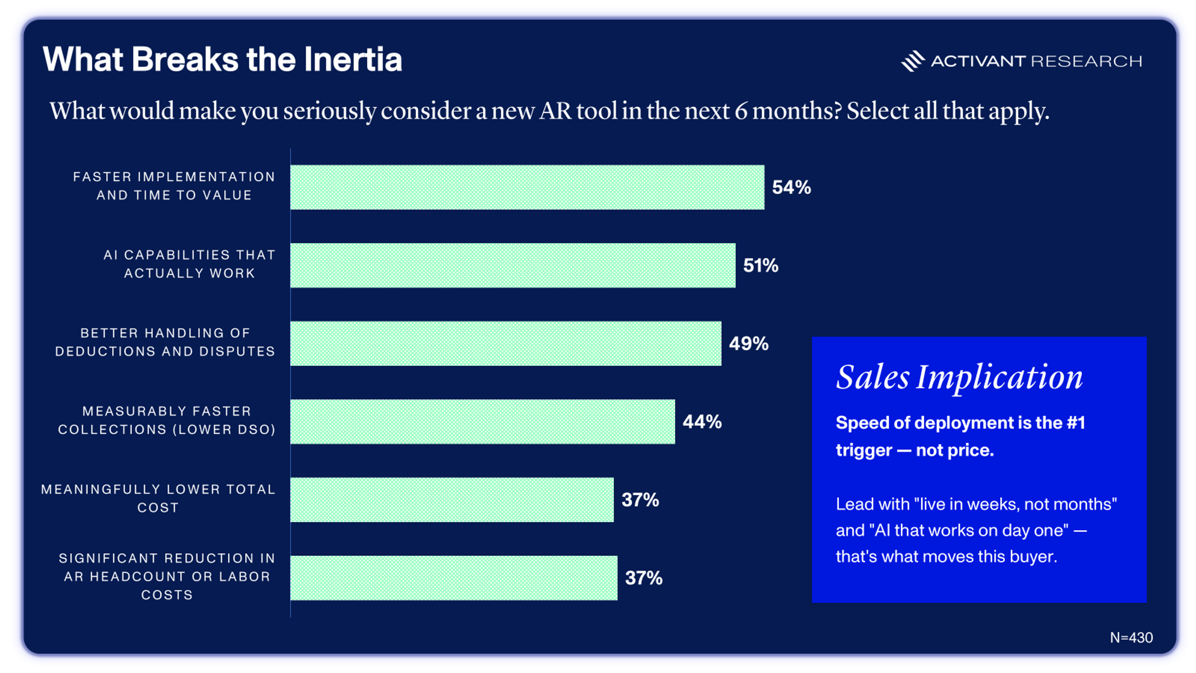 The hierarchy is instructive. Speed outranks price by 17 percentage points. This implication is clear: lead with deployment speed and demonstrable AI performance, not discounts. Legacy order-to-cash platforms that require six to eighteen months of implementation and configuration work are structurally disadvantaged against any challenger that can go live in weeks.