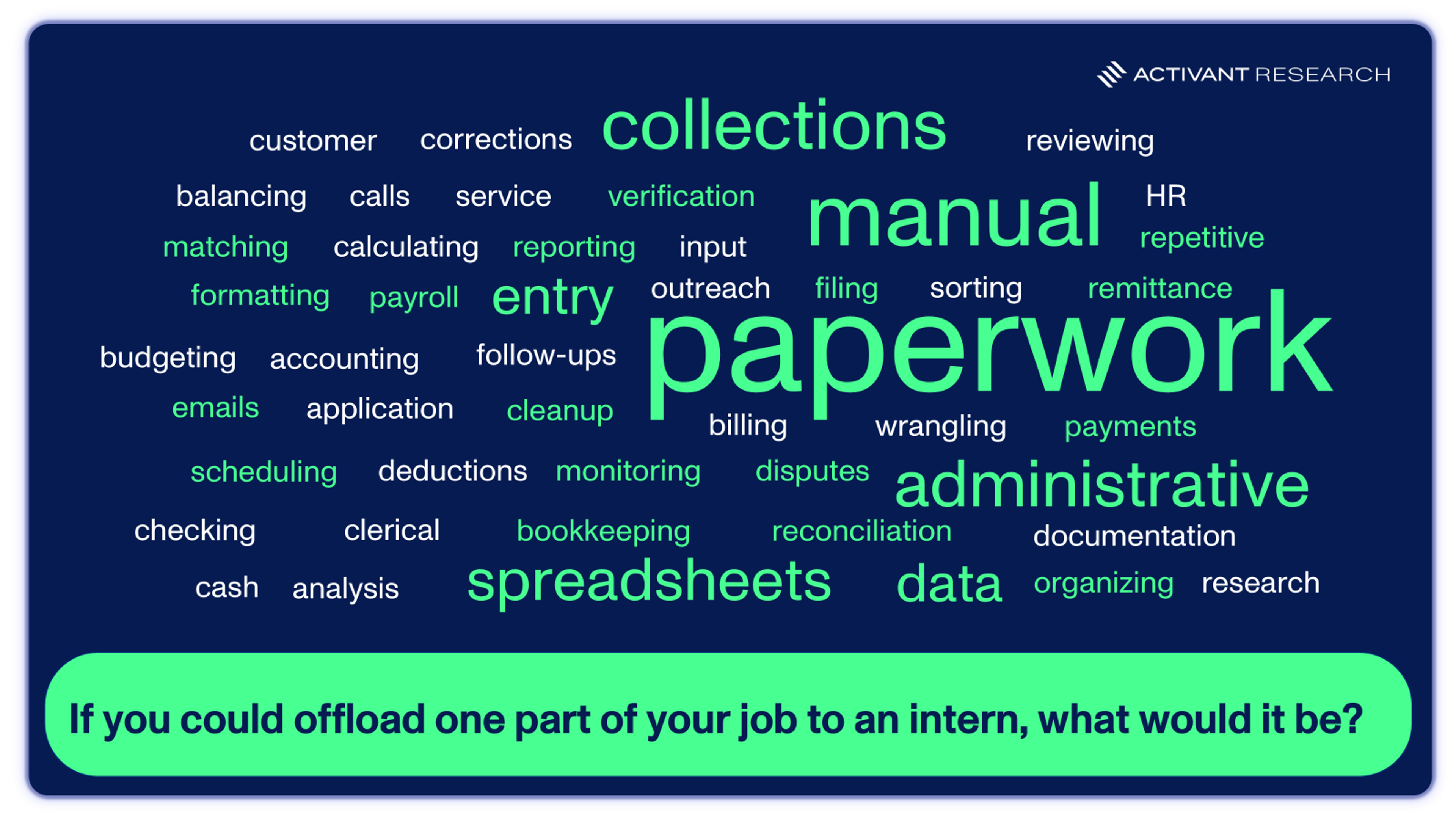 Sentiment data reinforces the numbers: AR professionals are deeply frustrated with the status quo. Asked what they would offload to an intern, the most common answers were "paperwork," "manual," "data entry," and "collections," all low-judgment, repetitive tasks that sit well below their skill level.