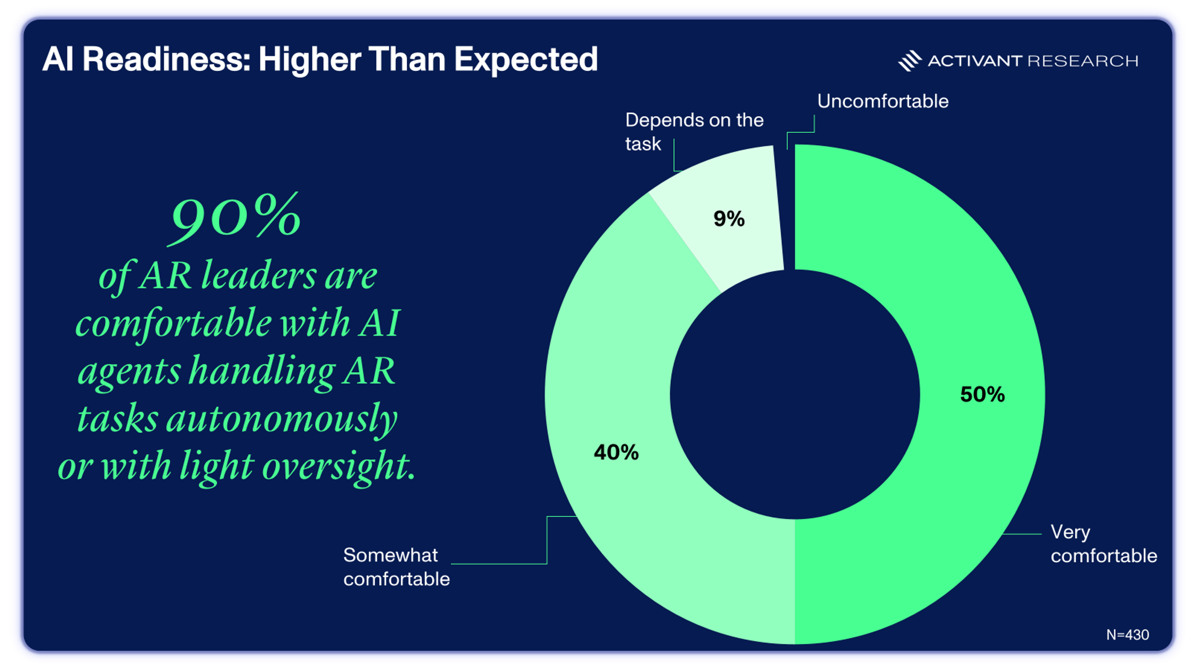 - AI readiness is already here. 90% of AR leaders are comfortable letting AI agents handle tasks autonomously or with light oversight; only 1% are uncomfortable. For a historically conservative and audit-sensitive function, that is a remarkable shift.