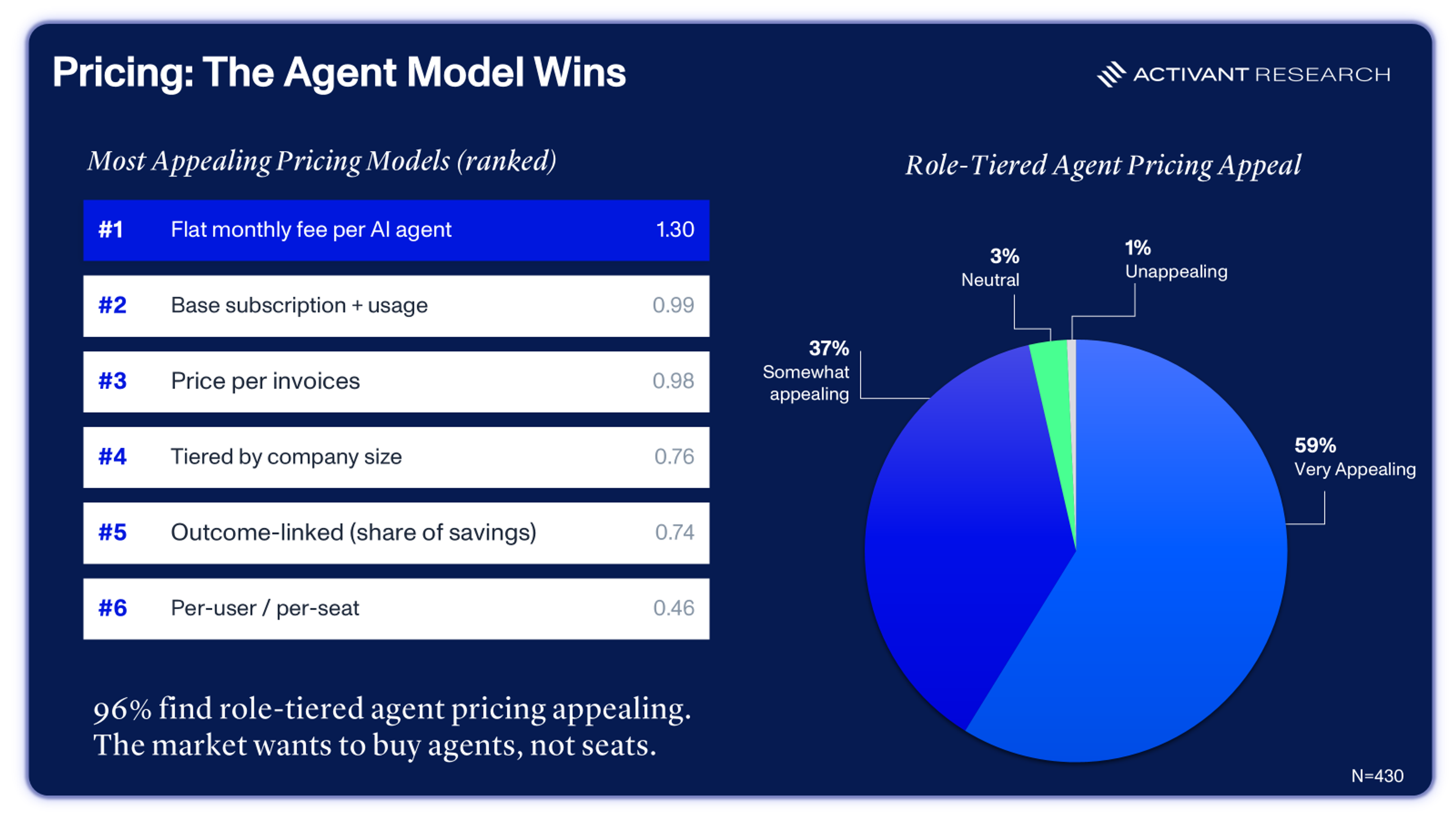 The most consequential finding, though, is how buyers want to pay. They have stopped benchmarking AI agents against software budgets and started benchmarking them against payroll. 96% find per-agent pricing appealing, and per-seat licensing ranked last in every revenue tier. That reframe matters well beyond AR: when software is priced as labor rather than seats, the ceiling on enterprise spend moves from the IT budget to the payroll line, and the addressable market expands accordingly.