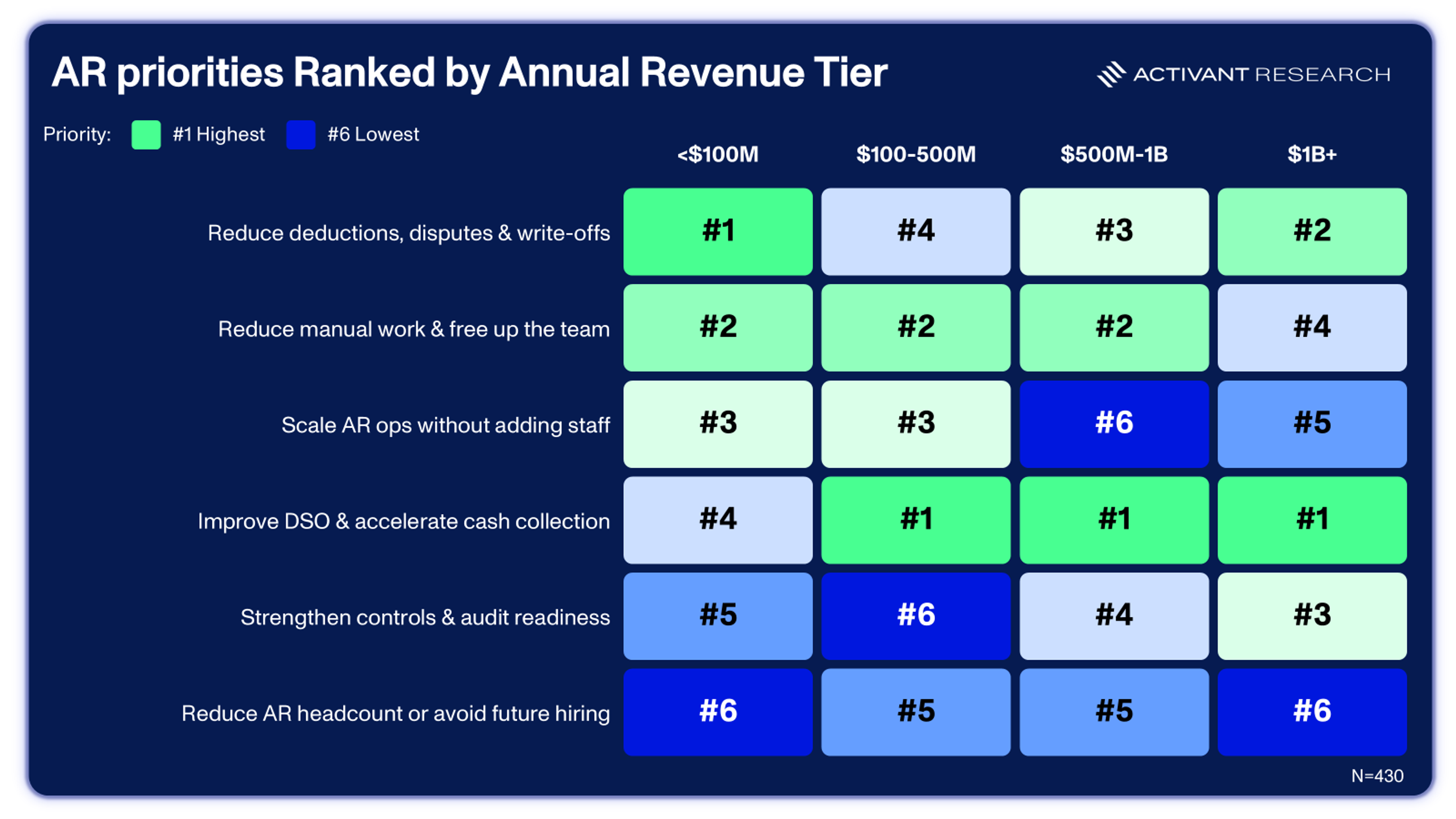 When we break the priorities down by revenue tier, the point becomes even clearer. Reducing AR headcount or avoiding future hires is, without exception, the lowest or second-lowest priority for AR leaders regardless of company size. The priorities that do lead shift with scale: smaller companies rank reducing deductions and write-offs first, while the mid-market and up prioritize improving DSO and accelerating cash collection. But across every segment, the focus is on outcomes, not downsizing.