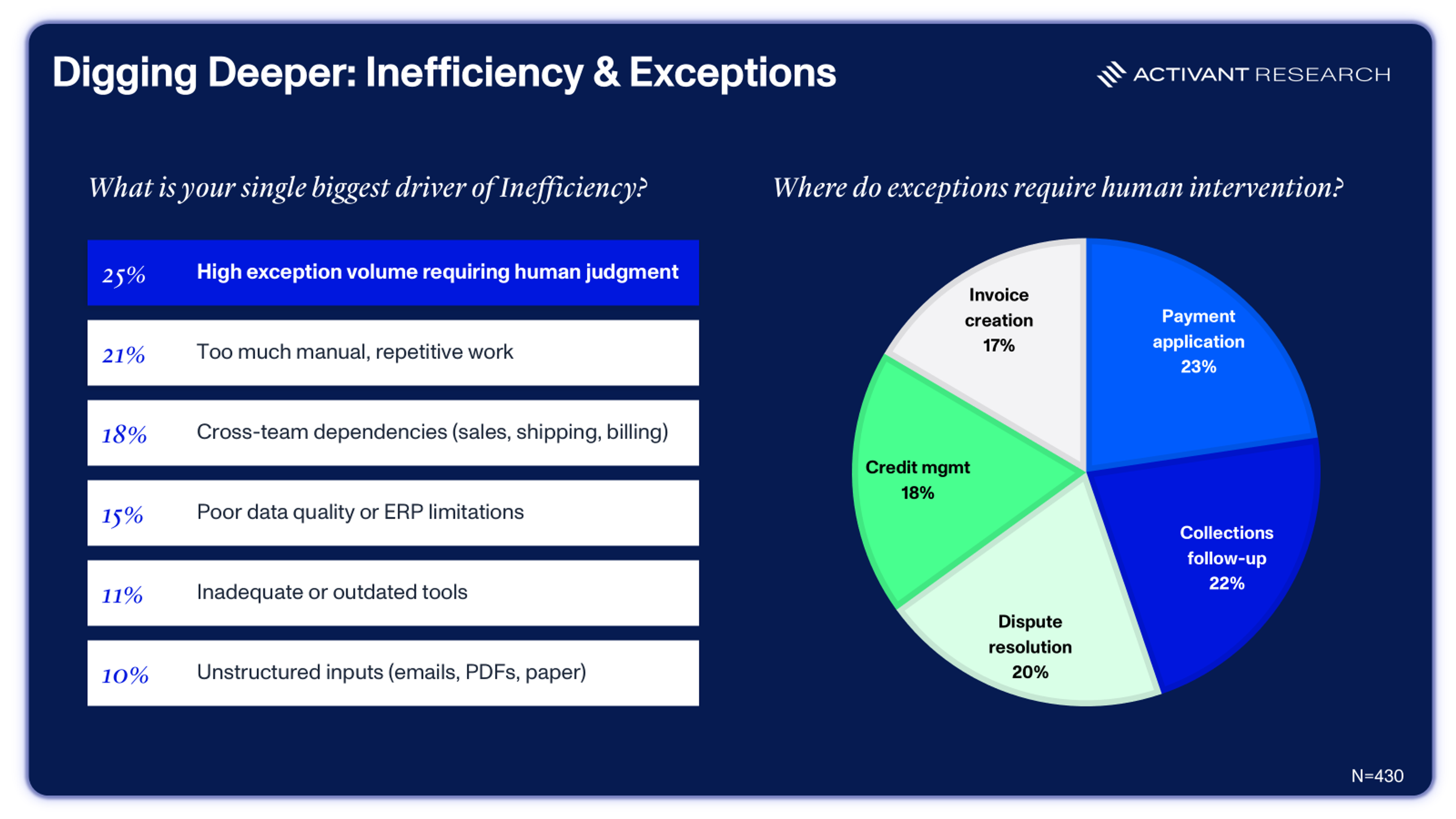 Across AR, exceptions dominate. When asked to name the single biggest driver of inefficiency in their operations, AR leaders pointed to high exception volumes that require human judgment (25%), and excessive manual, repetitive work (21%). Together those two factors account for 46% of responses, and both sit squarely in the sweet spot for AI agent automation.
