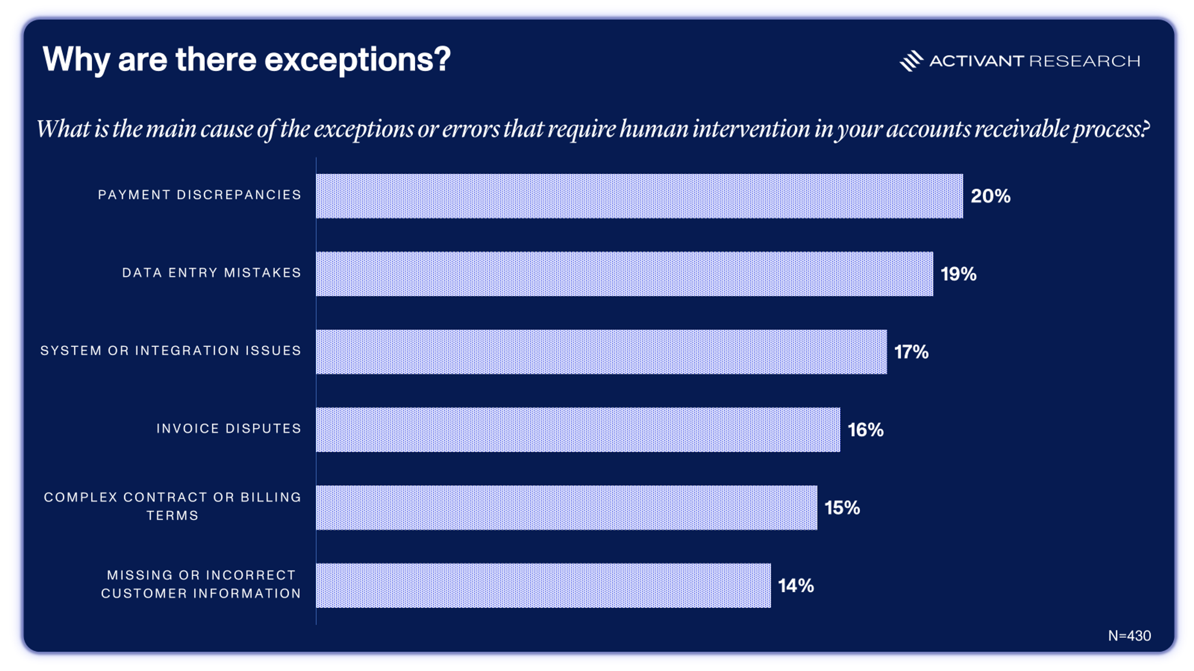 Root causes are equally diffuse: payment discrepancies (20%), data entry mistakes (19%), system or integration issues (17%), invoice disputes (16%), complex contract or billing terms (15%), and missing or incorrect customer information (14%). No single root cause accounts for more than a fifth of the problem.