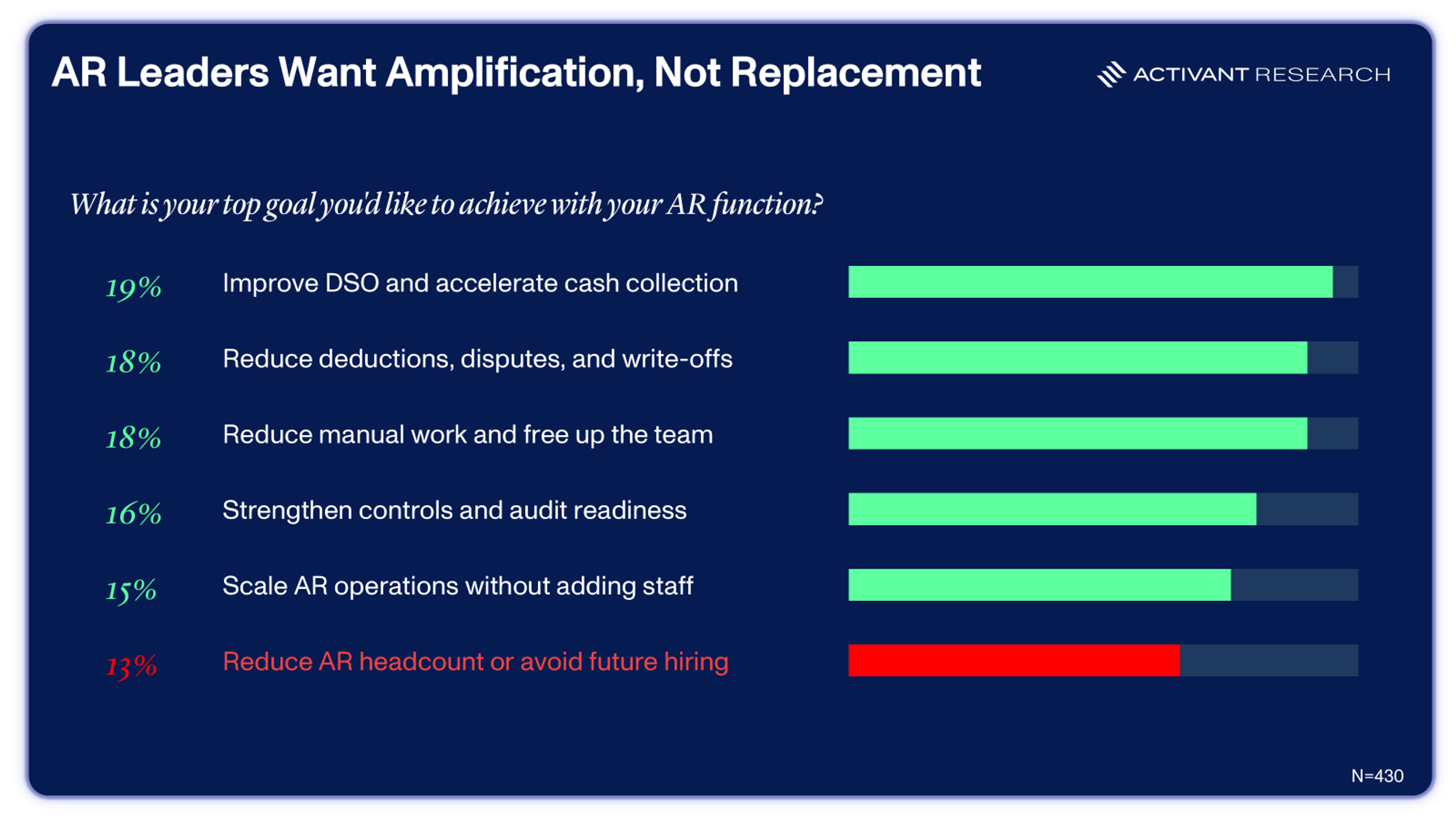 AR leaders aren't buying automation to shrink their teams. They're buying it to amplify what their existing teams can accomplish: faster cash collection, fewer write-offs, more capacity per person. The ROI framing that resonates with this buyer is speed and throughput, not labor elimination, and any vendor pitching headcount reduction as the headline value proposition is misreading its audience.