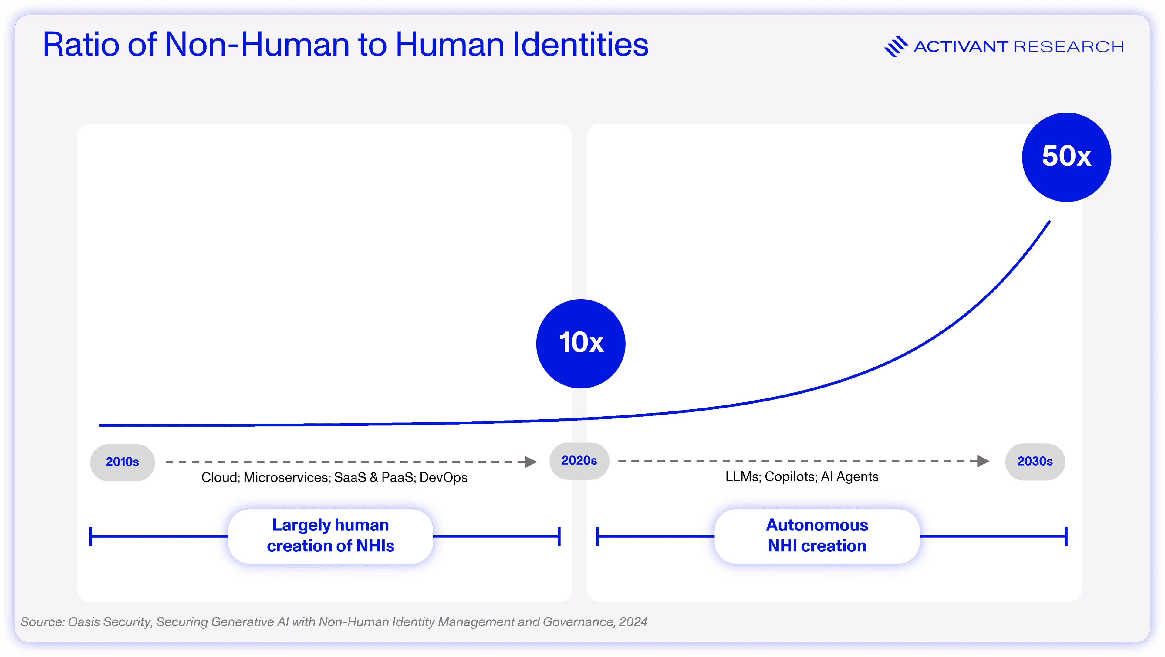 Driven by cloud adoption, business processes automation and a shift to microservices architectures, NHIs are growing at a rapid rate of ~2.5x every year, outnumbering human identities by a factor of 45x.2 Yet, the amount spent on NHI security is only 5%–10% of the $76bn spent on human identity security.3 If that sounds concerning, consider this: enterprises are racing to adopt AI agents, and soon every SaaS app will launch its own AI agent feature. We are about to witness a massive acceleration in the proliferation of NHIs.