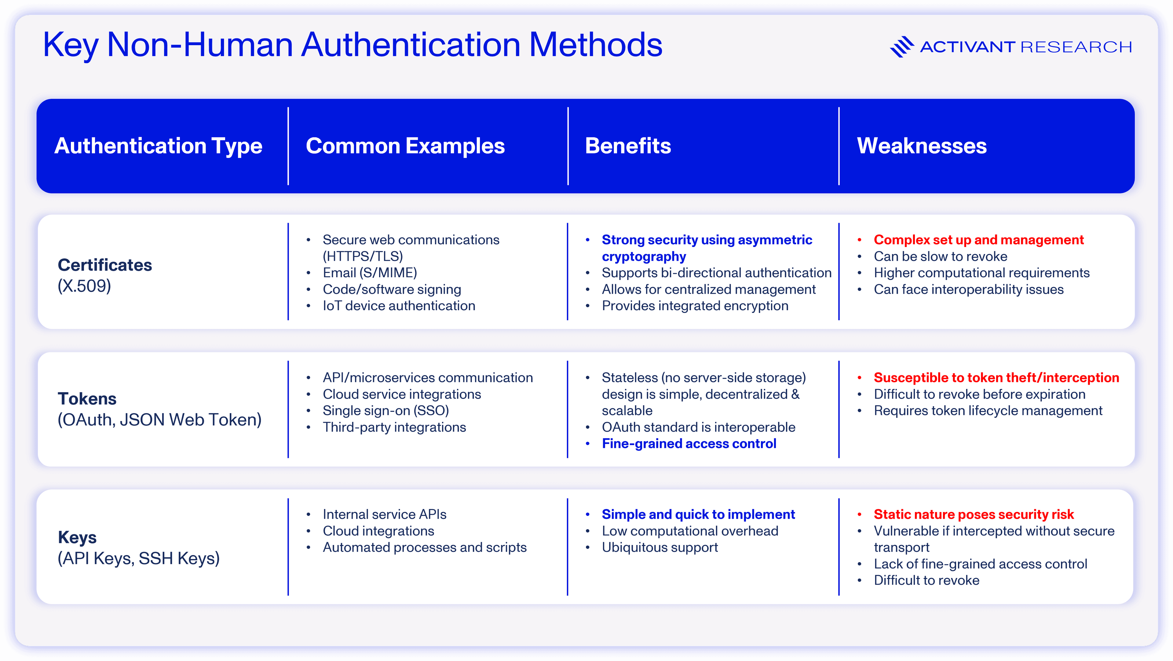 API keys are among the most recognizable NHIs, but their static nature carries security risks. OAuth tokens are likely the most prevalent, and users will recognize their fine-grained authorization when granting services access to view Gmail account details for single-sign-on purposes. However, OAuth tokens are also susceptible to theft and hijacking and they can be challenging to manage in distributed systems – since their expiration times are fixed at creation, revocation across widespread systems becomes difficult. Certificates provide the most robust security but require costly and complex management infrastructure. As a result of these trade-offs, the industry has standardized on using OAuth tokens for most use cases, and the security risks that this presents are critical for understanding the deeper issues posed by NHIs for identity security.