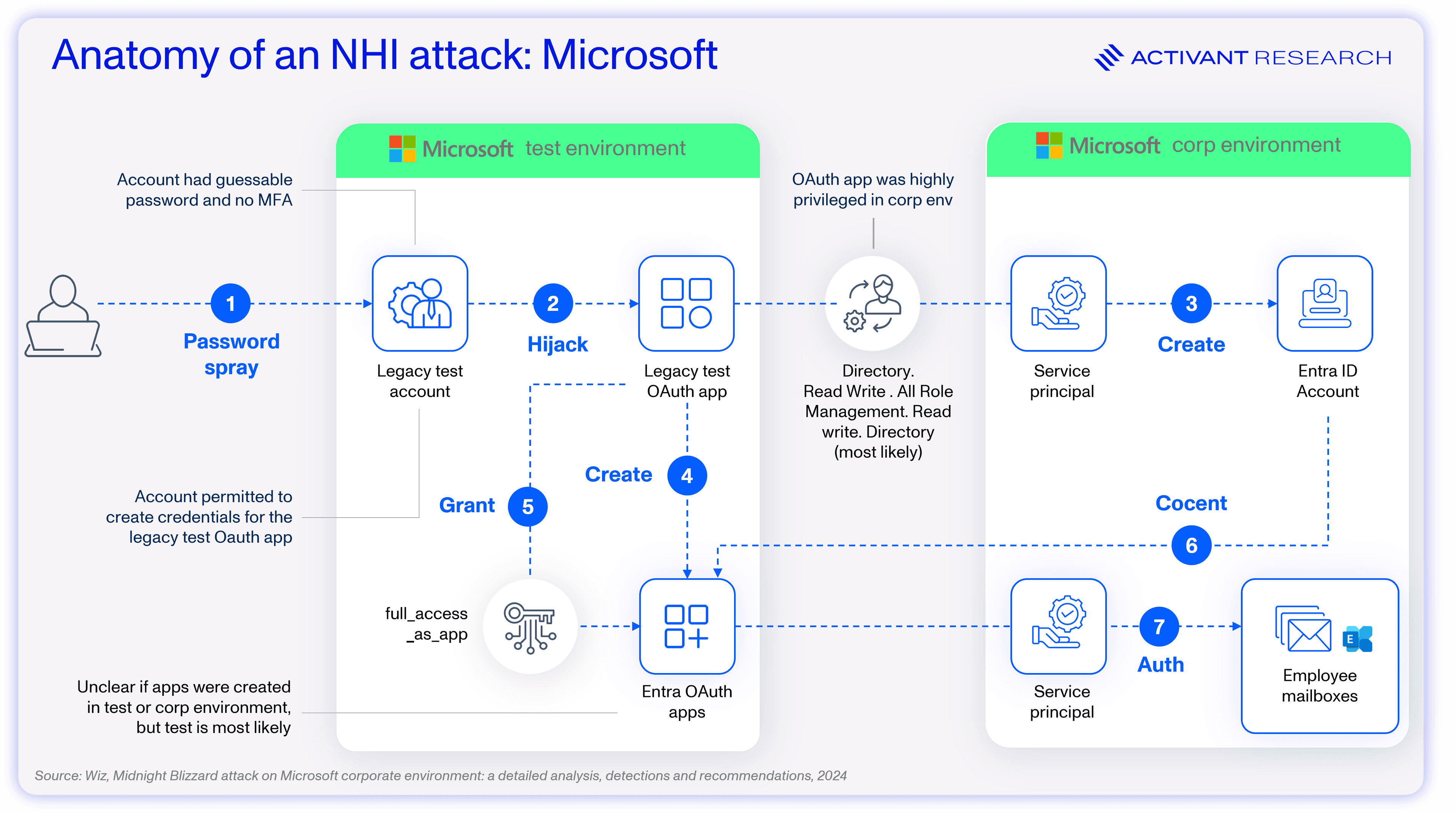 In the case of Microsoft’s attack by an alleged Russian state-sponsored actor known as Midnight Blizzard, attackers were able to leverage an NHI – a legacy OAuth test application – to gain access to Microsoft’s IT environment. Because the account possessed excessive privileges, the attackers were able to create new applications and user roles, move laterally within Microsoft’s IT environment, and eventually access Microsoft employee emails. While the details are technical, the key takeaway is clear: