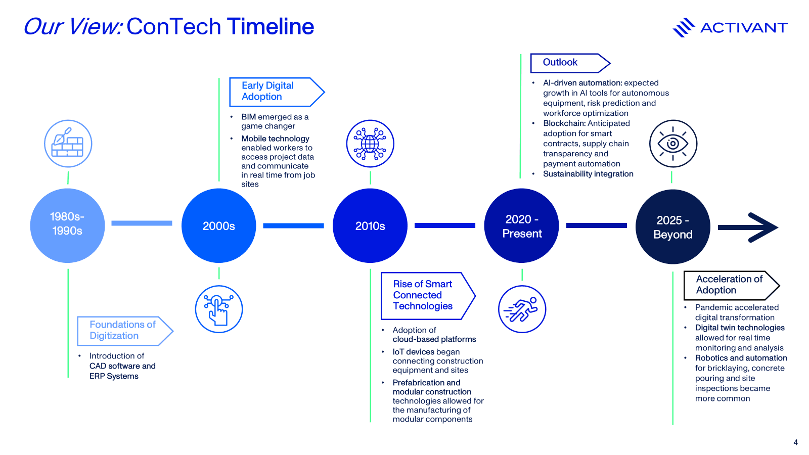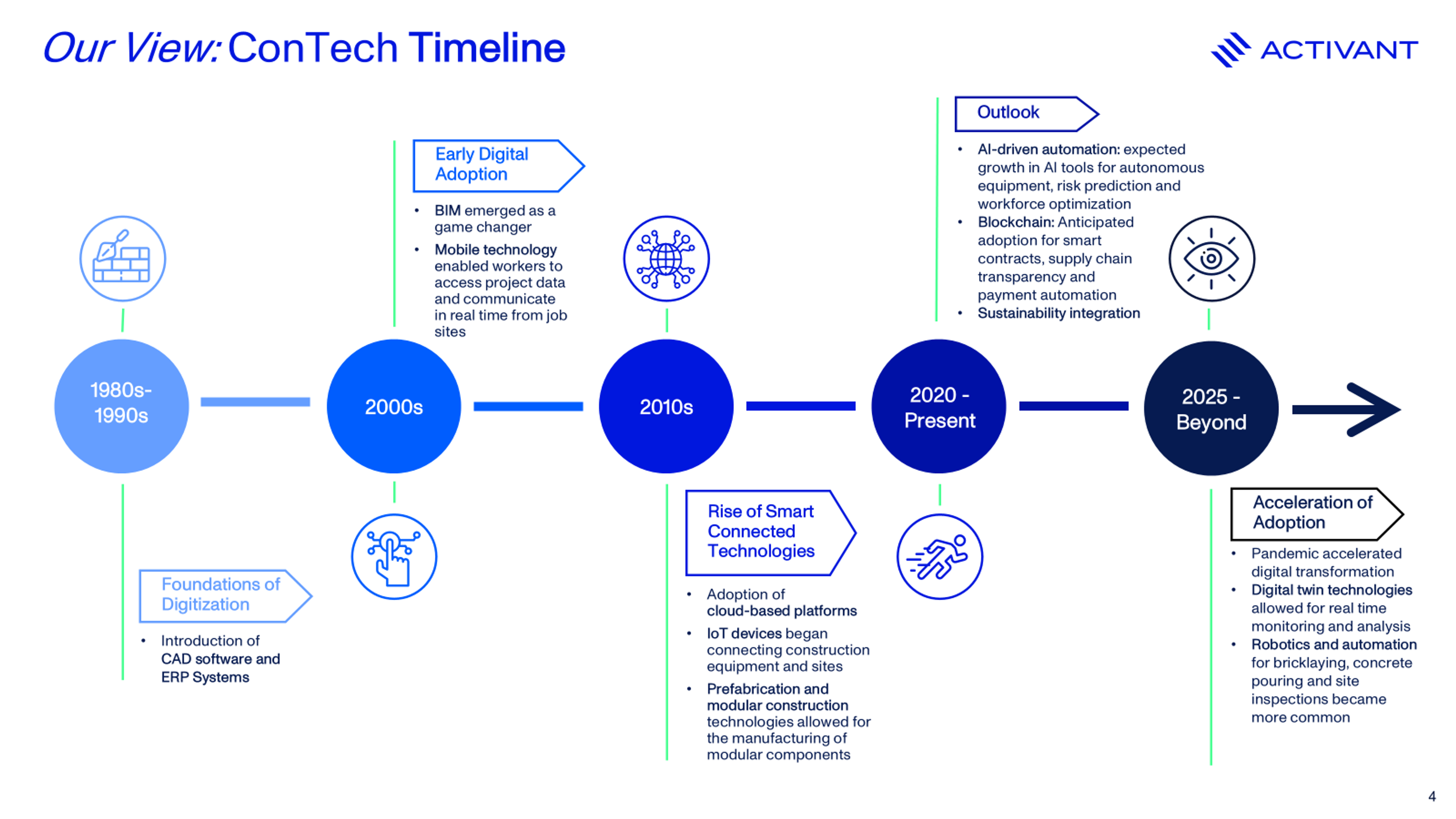 The construction industry is poised for a digital revolution. Despite facing the persistent challenges of a fragmented ecosystem, an ageing workforce, lack of spending on technology, and tight industry margins, the tide is turning, and increased investment is driving the adoption of ConTech. While adoption has been uneven, with segments like project management and BIM leading the way, significant opportunities remain. Government support, client demand, increased competition in the market, and a generational shift in the management landscape are further accelerating this transformation. Increased investment underscores the industry's recognition of ConTech's potential to address the productivity challenge that has plagued the industry for years.
