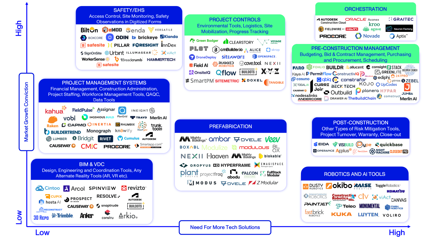 To help understand the opportunity, we arrayed the segment-specific tools and solutions on a market map with our assessment of the need for tech solutions on the horizontal axis, and our conviction in market growth on the vertical axis.