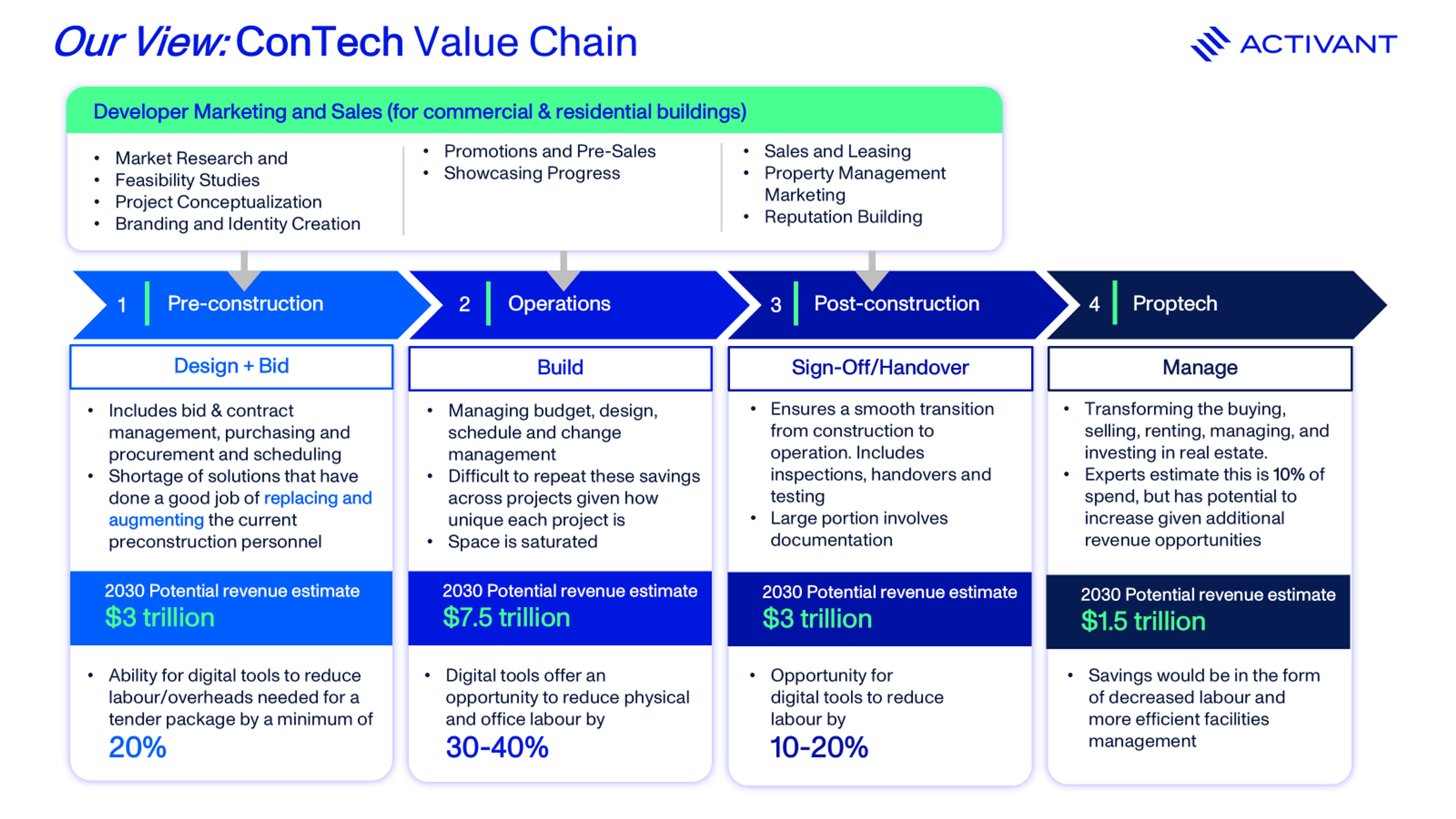 But it’s not all doom and gloom. This highly complex and dynamic industry also presents a significant opportunity. Global building floor space is on track to double by 2060 – the equivalent of adding an entire New York City every month for 40 years.4 Meeting this surging demand for infrastructure and housing, amid chronic labor shortages (in developed markets) and rising cost pressures, will require a technological revolution in construction. Construction Technology (ConTech) startups looking to shake up the status quo are slowly gaining traction. These innovative companies offer digital tools, software, and solutions to address the major challenges faced by construction companies seeking to modernize and harness technology to dramatically improve efficiency.