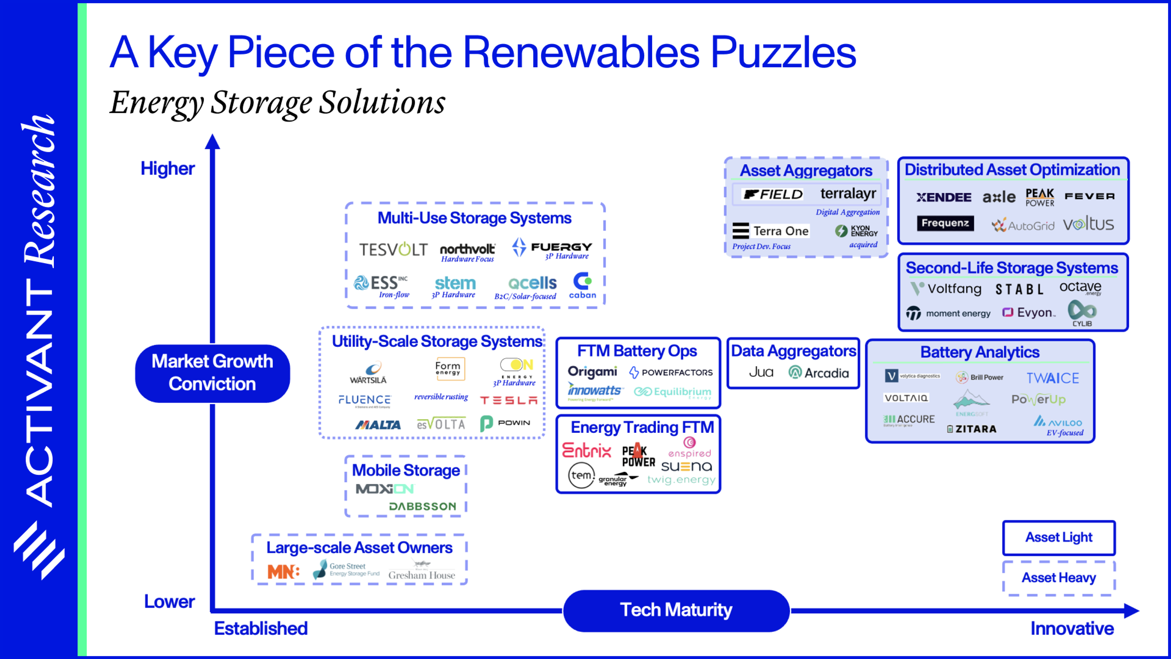 Asset Aggregators combine and manage multiple BESS assets. Given Activant’s preference for software solutions, weare primarily interested in players that use software to monetize them as a “unified asset” rather than trading each asset individually (which is the status quo in the market). Asset aggregators participate in wholesale energy trading and ancillary services such as frequency response and can offer proprietary flexibility products such as imbalance load hedges. In an ideal world, they will have customers with opposing load profiles and generate “alpha” from the offsetting trade. Consider, for example, an industrial manufacturer wanting to buy power between the hours of 12-2pm (effectively discharging one of the batteries) and a solar park wanting to sell power (charging one of the batteries) at the same time. Because the two customers’ load profiles cancel each other out, the asset aggregator does not have to move any physical electrons while charging both parties for the provided service. We think this is an exciting business model but note that ithas yet to be commercialized profitably at scale.