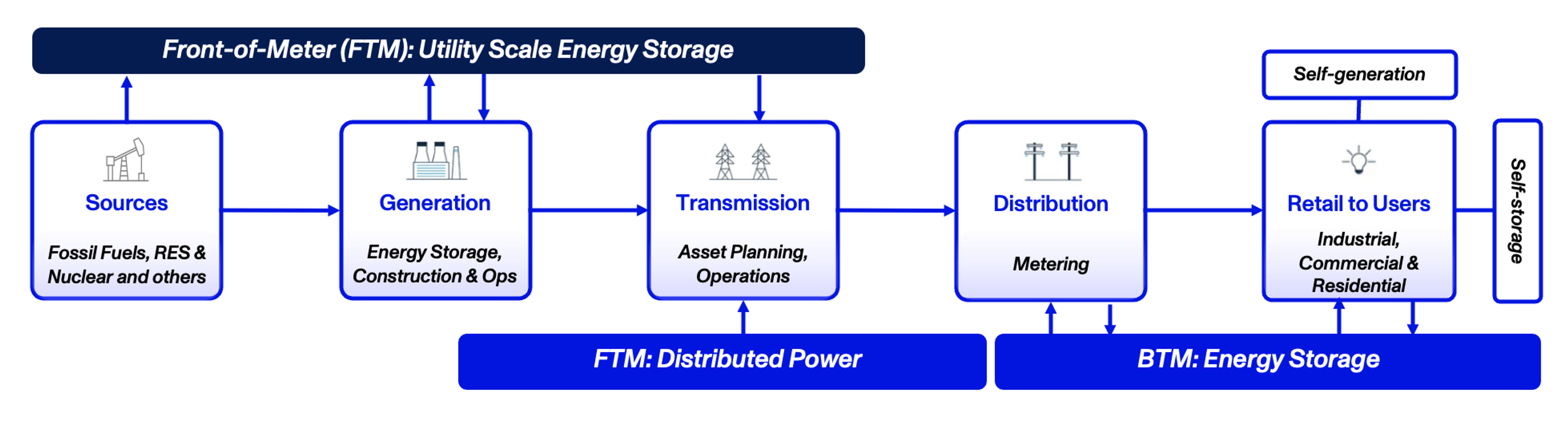 The energy storage ecosystem can be mapped across the value chain of the electricity system. This segmentation includes energy sources, power generation, transmission lines, distribution systems, and the end user. Those services and solutions provided by utilities are often described as “front-of-meter” systems (FTM), while the distribution and consumption of power by end-users is said to fall “behind-the-meter” (BTM).
