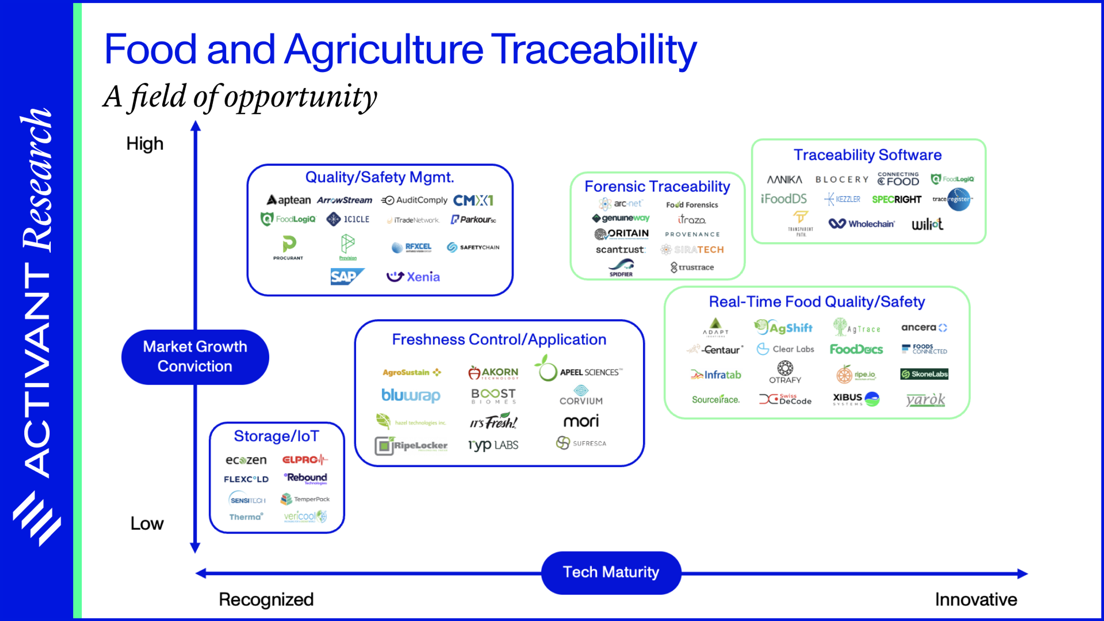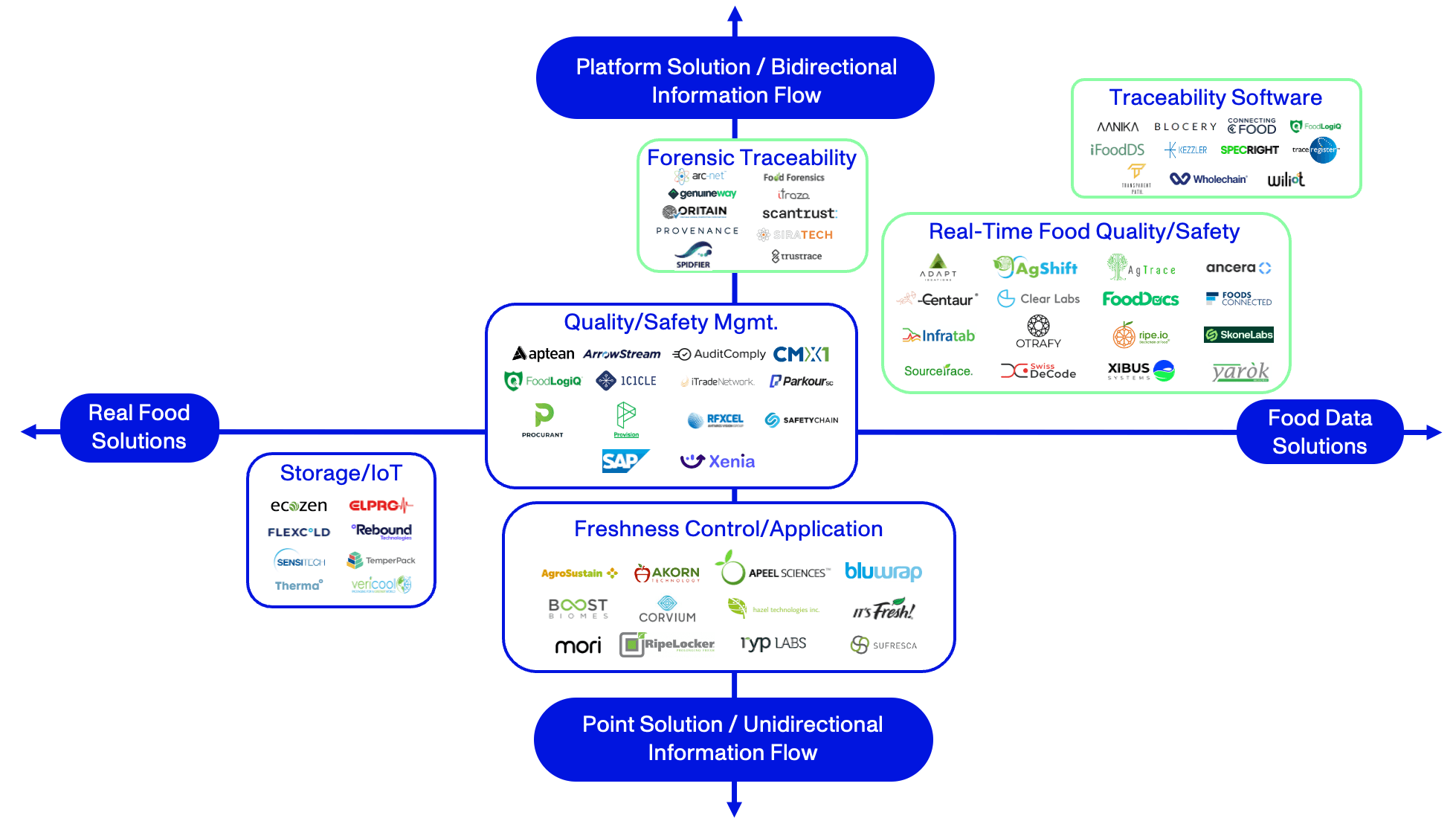The market map below shows where current players are active in the market and the sub-sector they’re operating in. We consider those dealing in food data and built off platforms with multi-directional information flow the most attractive, specifically in the areas of: