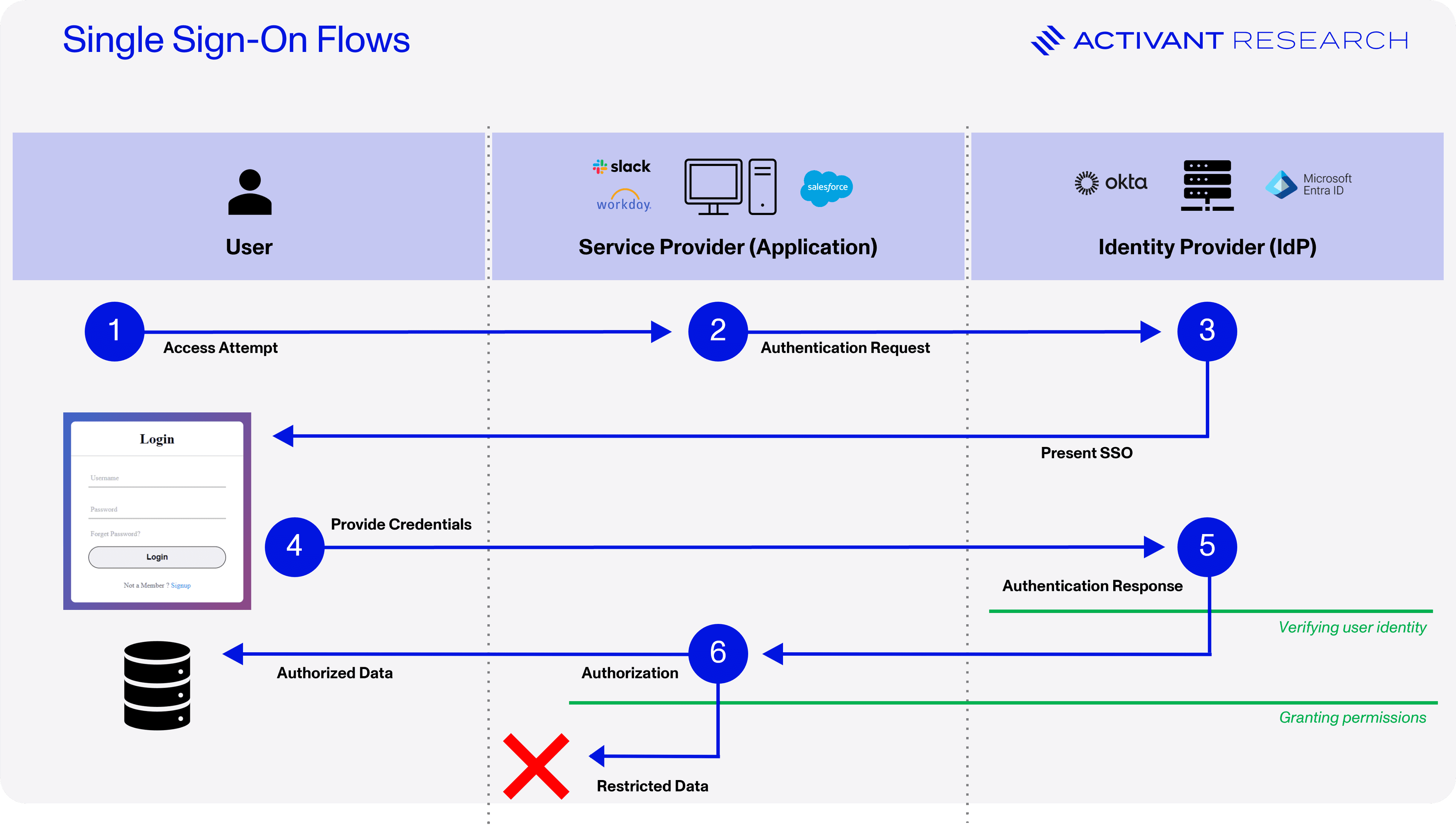 The sensitivity of data stored in directories drove the market towards centralized and specialized Identity Providers (IdPs). Microsoft dominated this market in the on-premises era, and Okta rose to prominence in the shift to the cloud. Centralized IdPs enable Single Sign-On (SSO), allowing users to log into hundreds of apps with a single credential. Finally, authentication processes make use of multi-factors authentication (MFA), such as checking whether a user is in possession of a registered device. See below for a technical breakdown of how SSO works today.