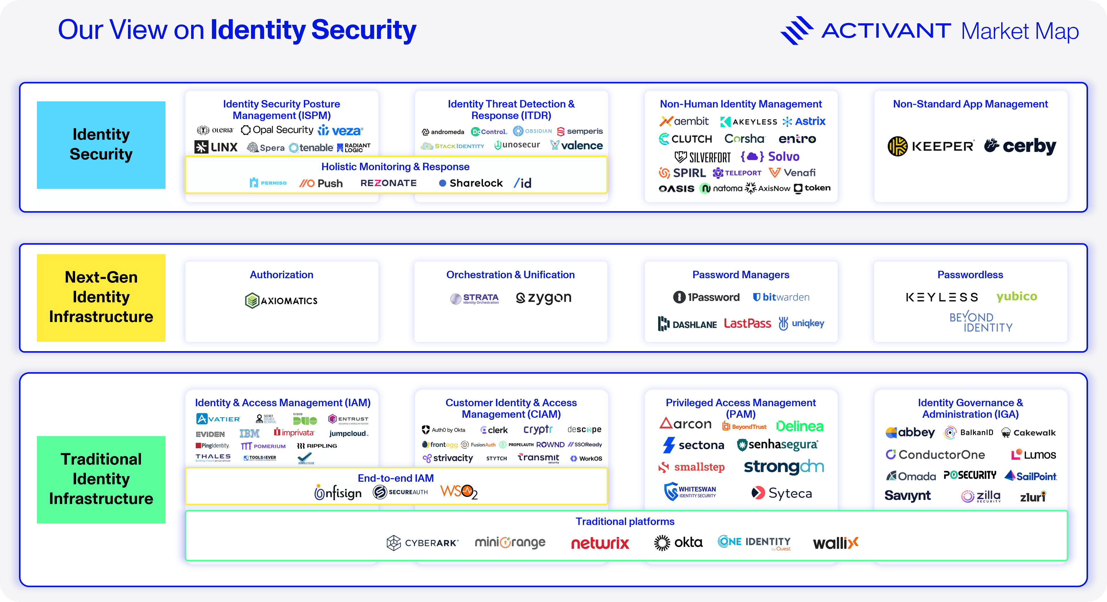 With these new innovations, it’s possible to implement multi-factor authentication methods that are passwordless and phishing resistant. It’s possible to continuously monitor enterprise systems for potential identity security gaps and implement best practices, from the principle of least privilege to proper identity lifecycle management. It’s also possible to monitor identity risks in real-time and universally log out high-risk identities. Critically, it’s not just possible – these solutions are autonomous, always-on and frictionless, overcoming cultural inertia. Our Activant market map details this new identity architecture, with security being built on top of both existing and next-generation infrastructure.