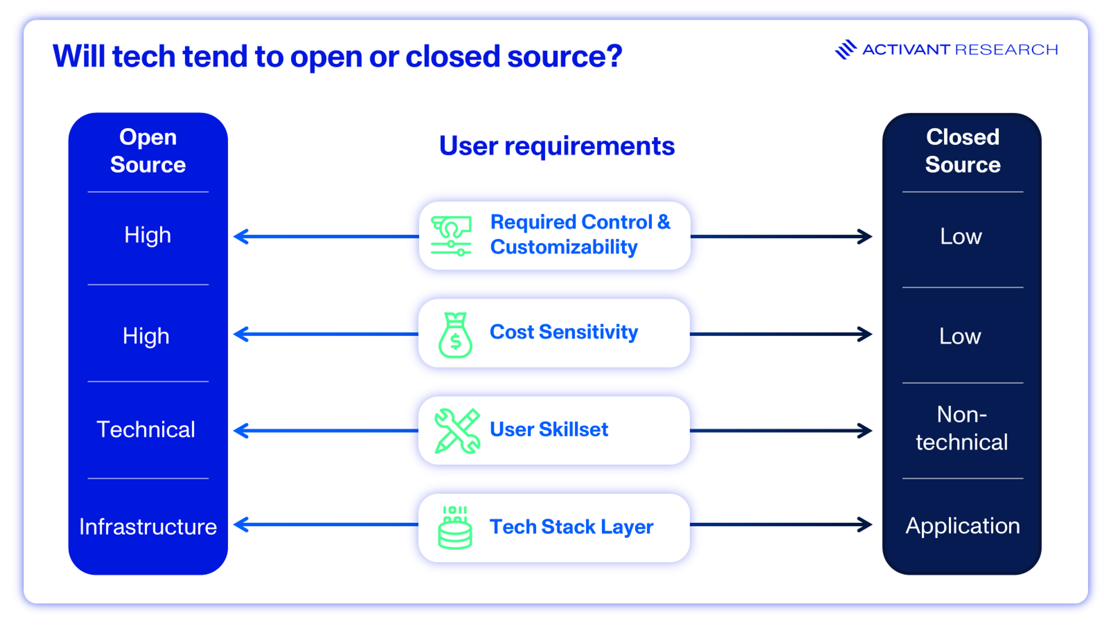 Looking at past technological waves like operating systems, databases, developer tools, SaaS apps, and web browsers is significantly revealing as it relates to when and why technologies tend to open or closed. Customization, control, and cost-sensitivity tend to flip the scales in open source’s favor, while ease of use and product quality can be a boon for closed source.