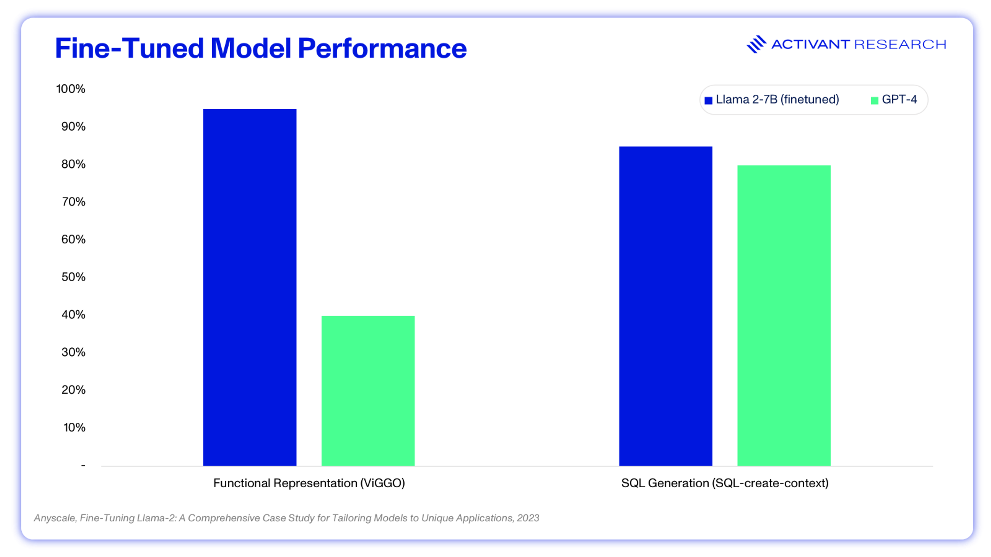 Fine tuning is the process whereby a pre-trained model is retrained on a much smaller but task-specific dataset to specialize its behavior. Fine tuning a model on a company’s past customer service conversations can ensure that its new answers are more specific, accurate and better at understanding company-specific jargon. One of today’s SOTA coding models is Qwen3-coder, a mid-sized (480B) open source model fine-tuned on coding data, indicating that fine-tuning can be a method for driving frontier performance.18 It can also keep costs down. A fine-tuned version of Llama 2-7B, capable of running on most laptops, outperforms GPT-4 (a model that runs on 8 x Nvidia H100 GPUs) on some tasks.